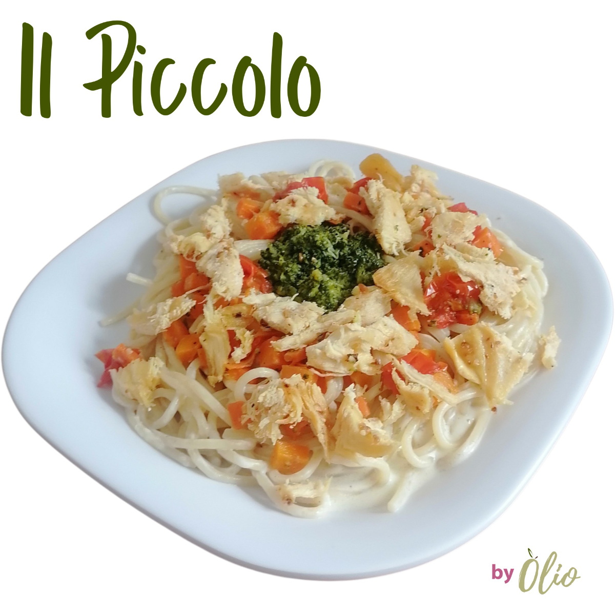 Pasta preparada con salsa cremosa de queso parmesano, jitomate y especias con trocitos de jitomate, zanahoria, brócoli y pollo.