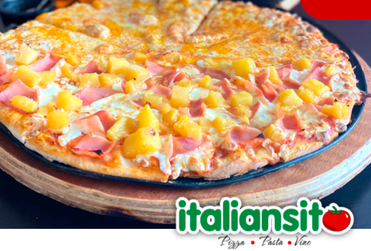 Pizza mediana de 6 porciones, hecha con queso, jamón y piña. Pizza grande de 8 porciones