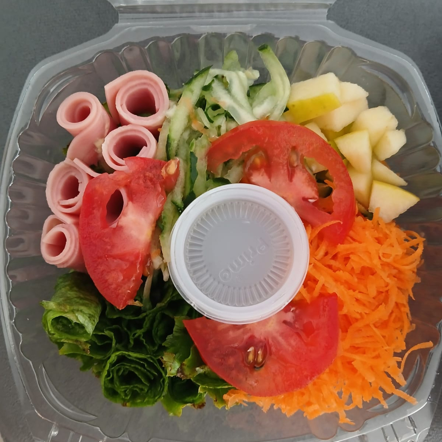 Ensalada a base de Lechuga en rollos, Pepino en cubos, Zanahoria rayada, Manzana en julianas y complemento a elección: ◇Jamón de Pavo ◇Queso Panela ◇Pollo a la plancha