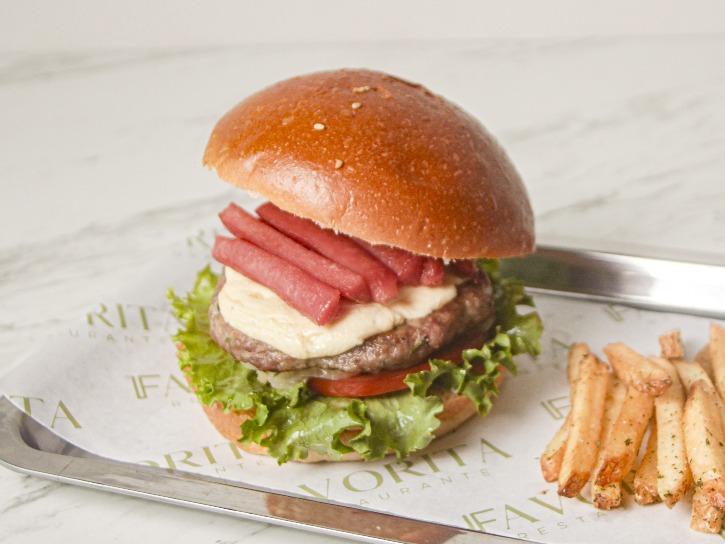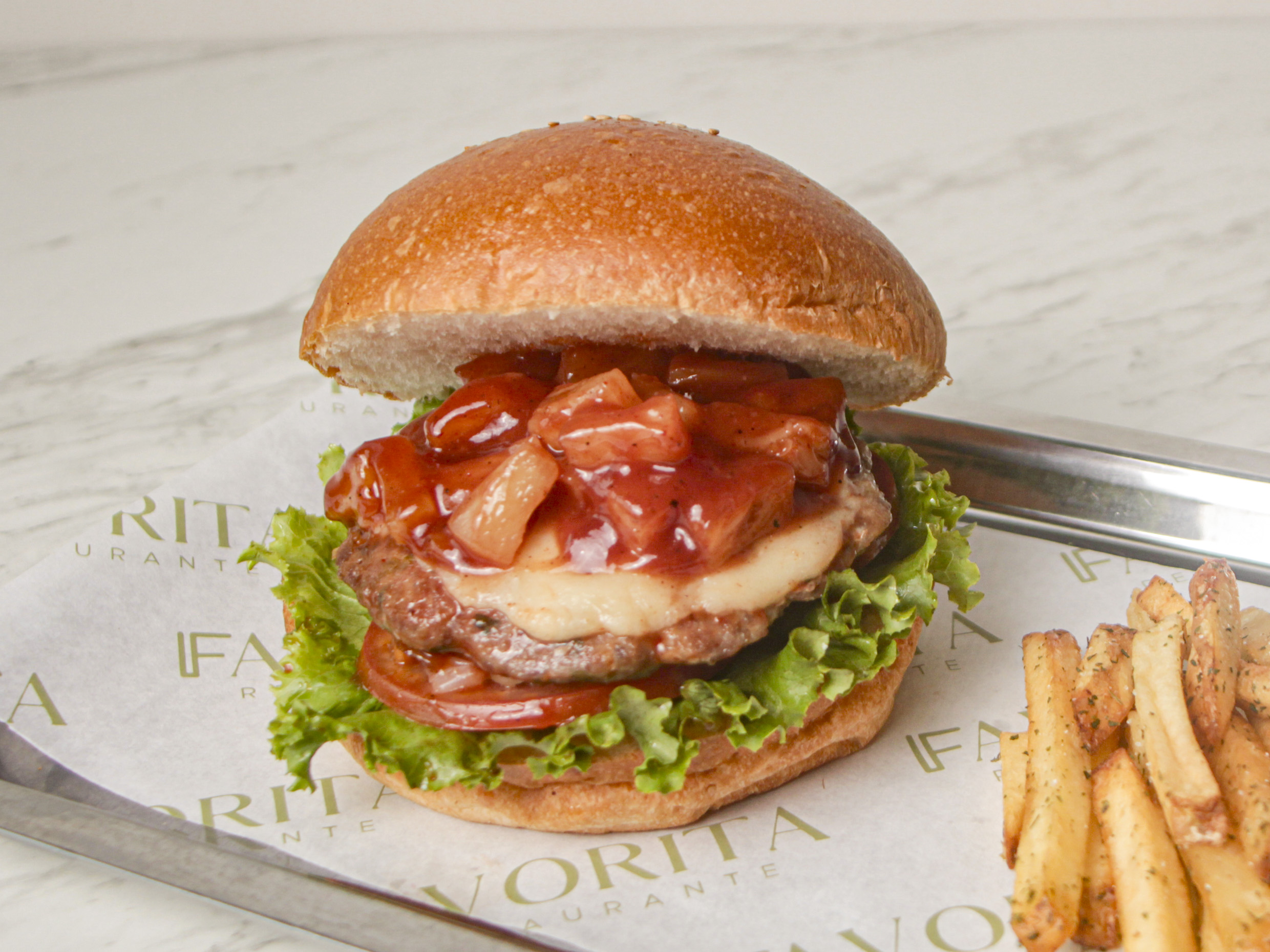 120 g De carne de res bañada en salsa BBQ, queso manchego, piña asada, pan artesanal y vegetales más 100 g de papas a la francesa.