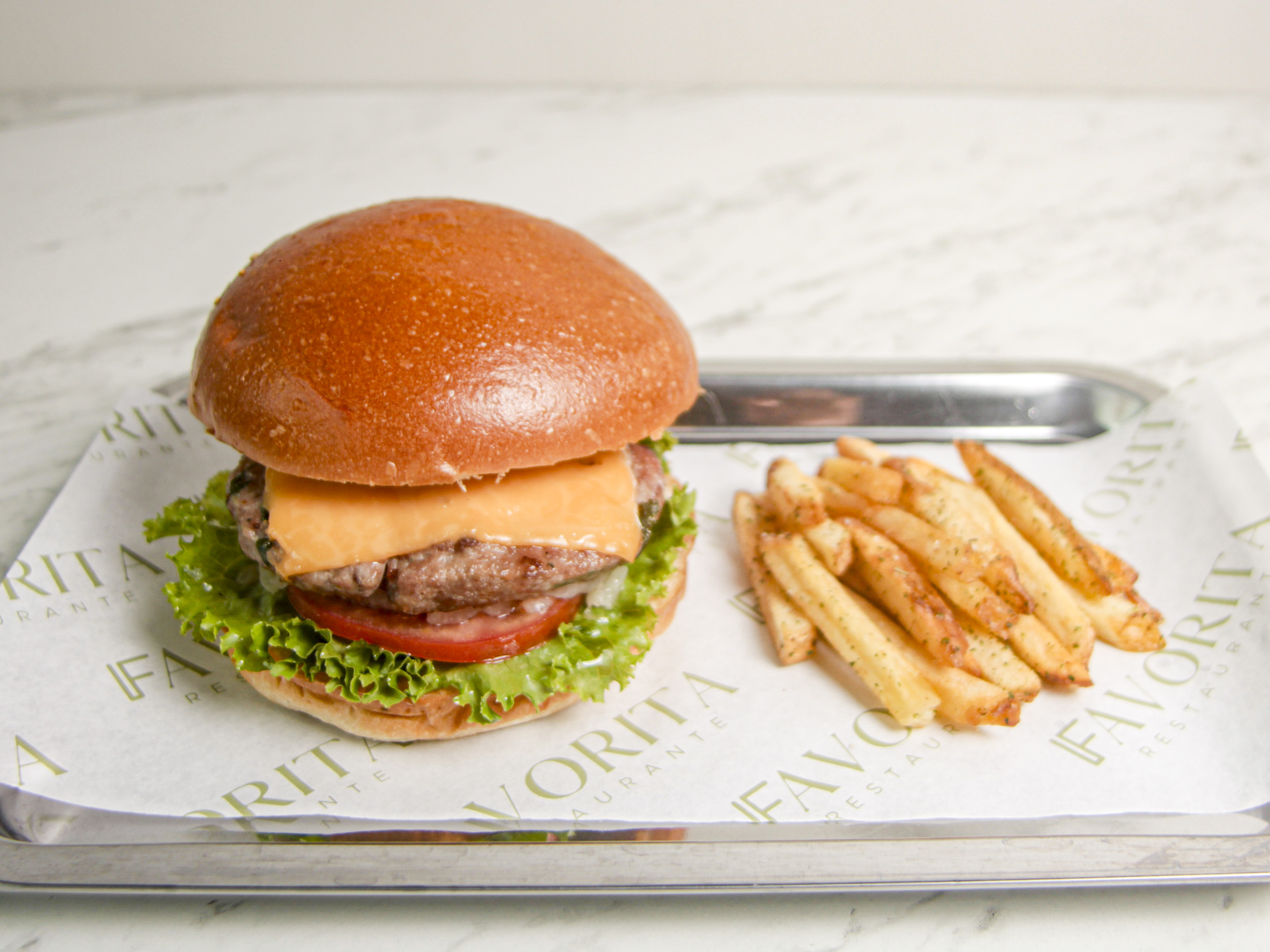 120 g De carne de res con queso americano, pan artesanal y vegetales más 100 g de papas a la francesa.