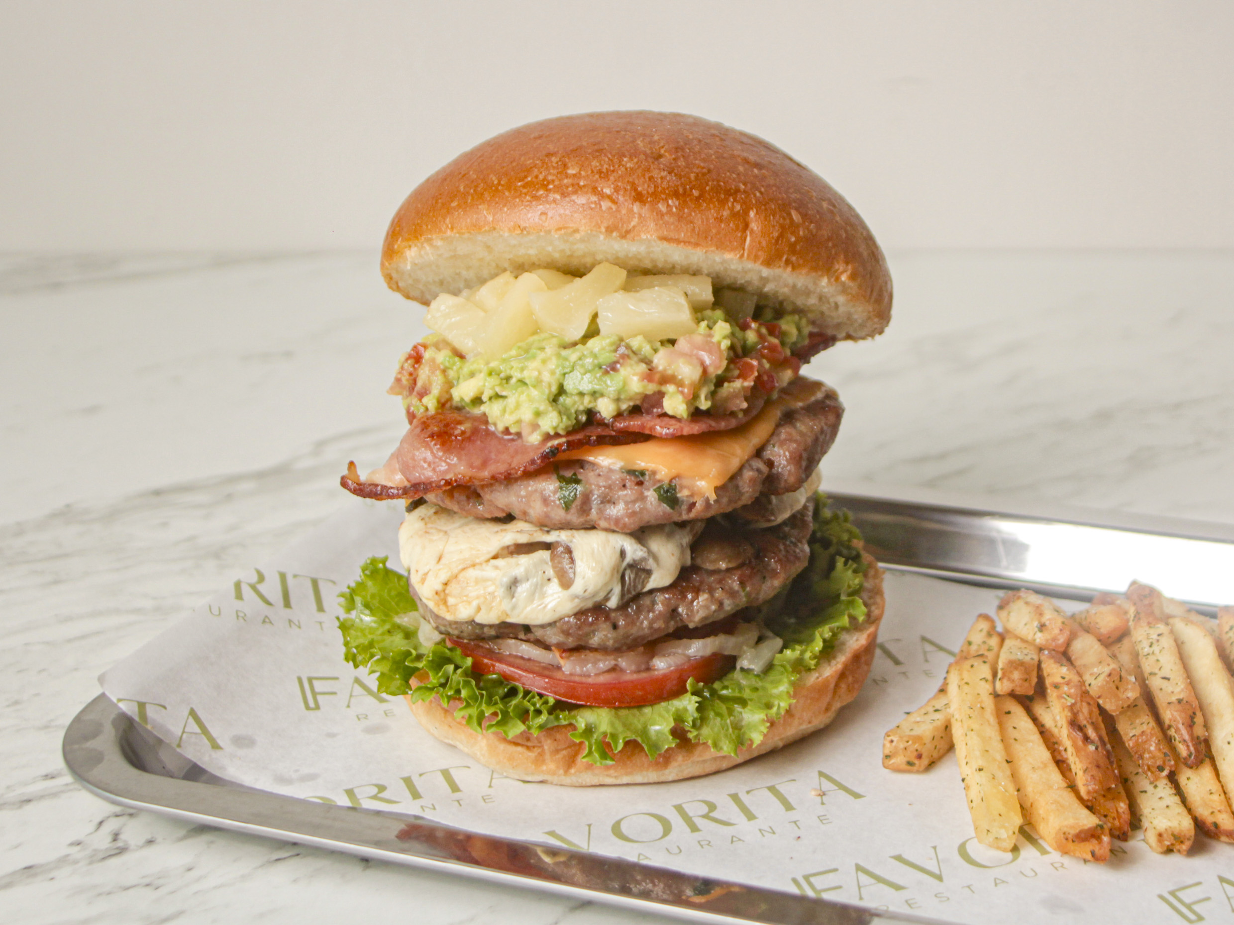 240 g De carne de res, guacamole, champiñón, piña, tocino, queso Oaxaca, queso americano, aderezo de la casa, pan artesanal y vegetales más 100 g de papas a la francesa.