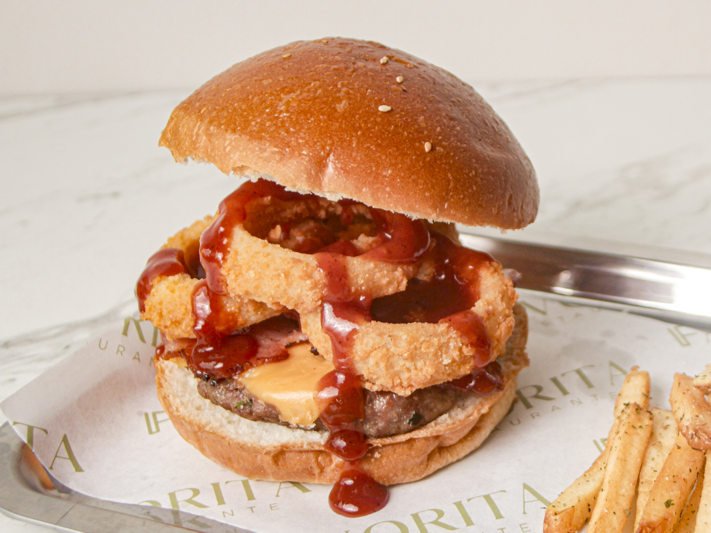 120 g De carne de res, aros de cebolla, queso americano, tocino, salsa BBQ, pan artesanal y sin vegetales más 100 g de papas a la francesa.