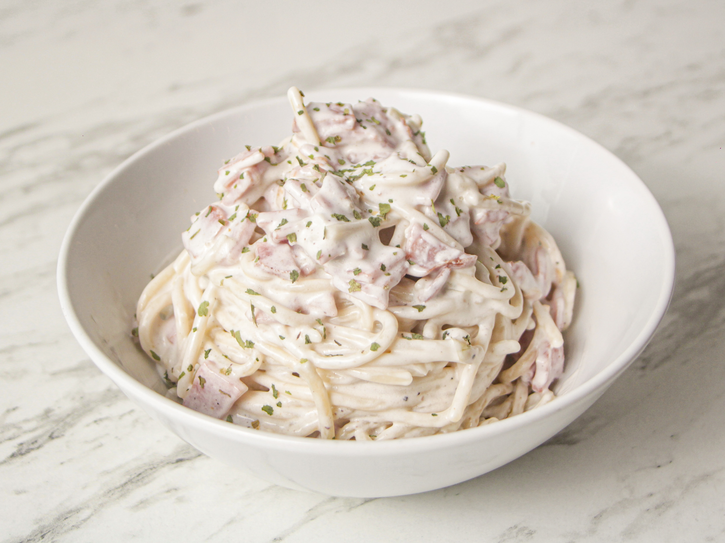 200 g De pasta. Crema, jamón de pavo y cebolla.
