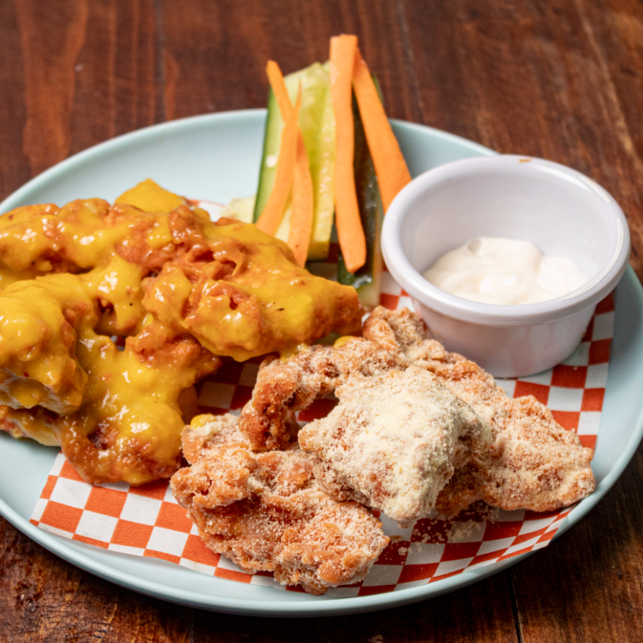 Tenders bañados en bbq o salsa búfalo, Ajo Parmesano, Mostza Miel.