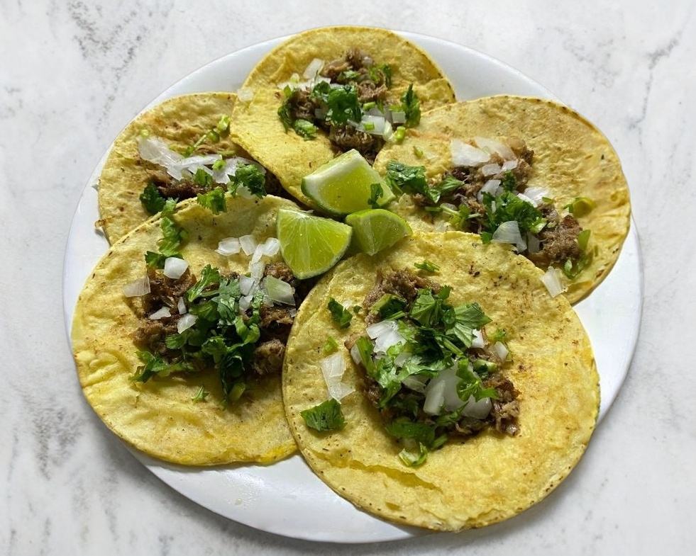 200 Gr. Tortilla de maiz mediana, carne de res. Cebolla y cialntro.Acompañado de cebolla morada con habanero