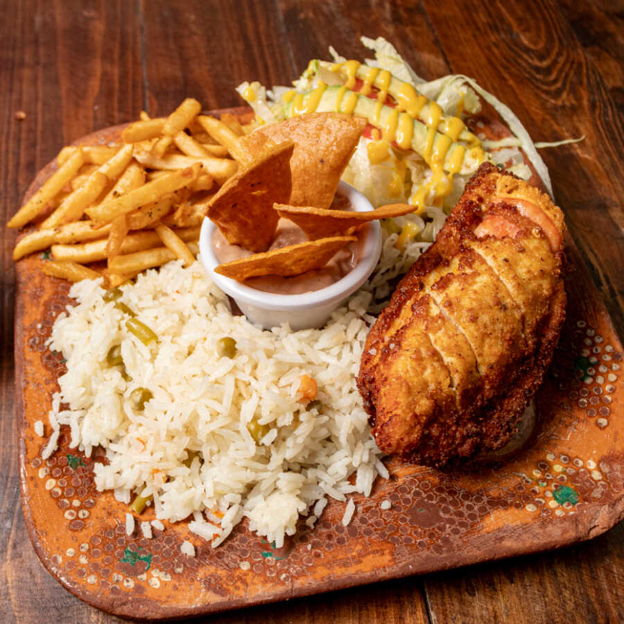 Crujiente Milanesa de pollo, Mayonesa, frijoles, aguacate,tomate, queso manchego, lechuga y aderezo de la casa.