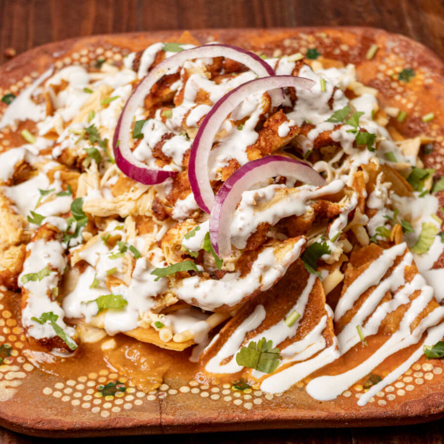Chilaquiles rojos o verdes, cebolla caramelizada, queso fundido, aguacate, lechuga, mayonesa y aderezo de la casa.