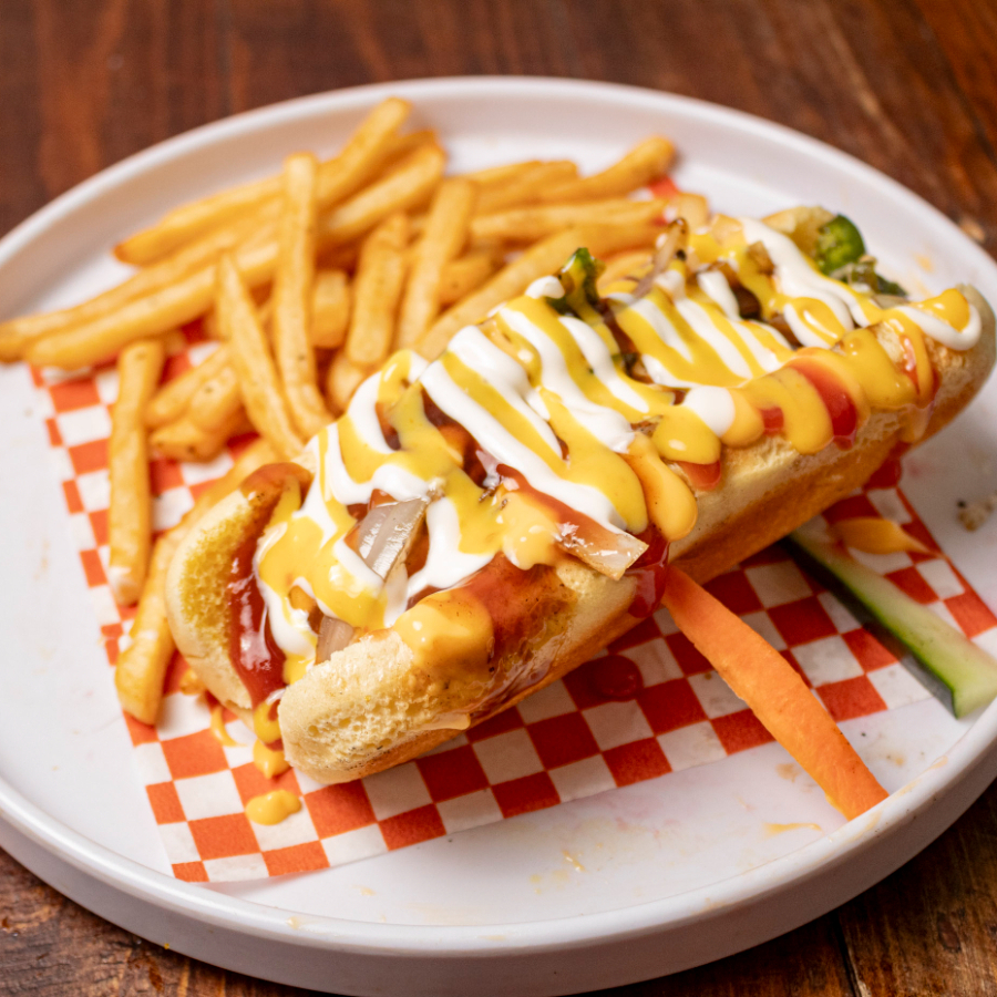 Cebolla con chile jalapeño Asado, catsup, mostaza y queso amarillo liquido.