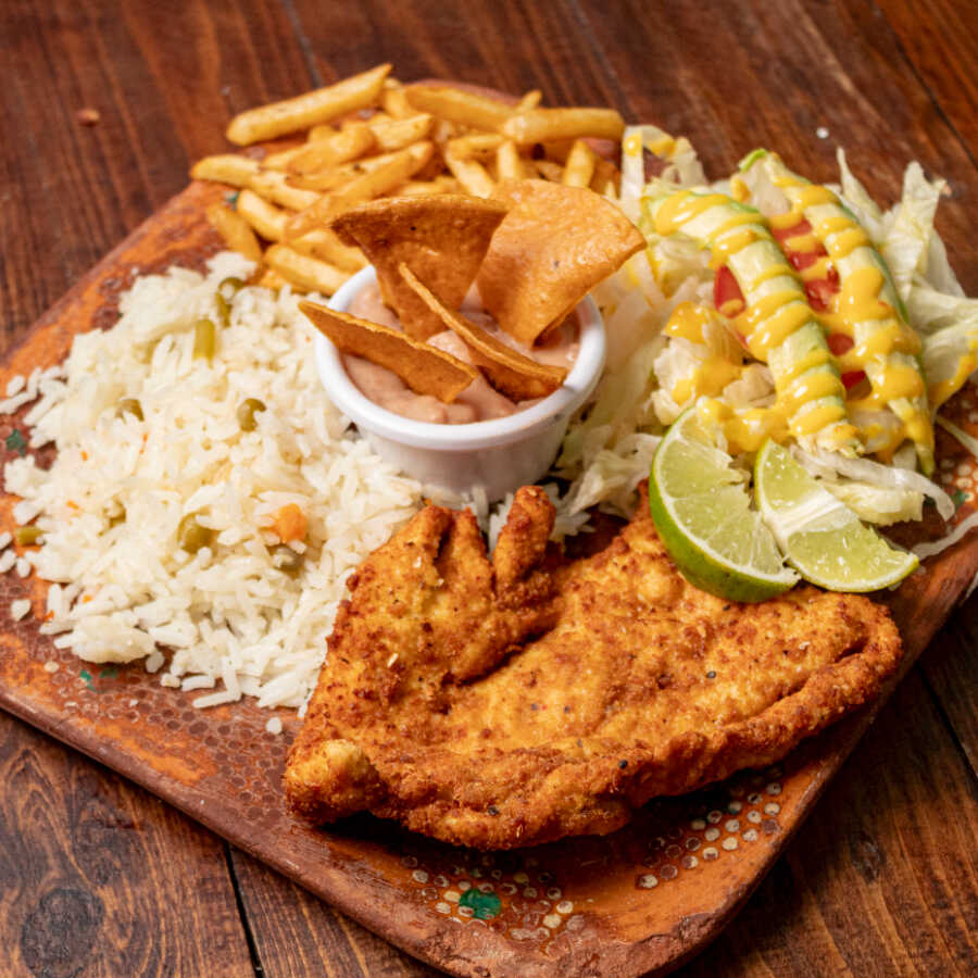 Crujiente milanesa de poĺlo con papas fritas, ensalada, frijoles y tortillas.