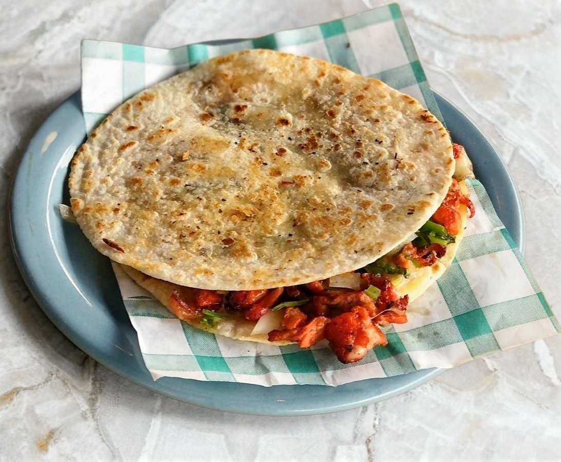 Tortilla de harina jumbo, base de aguacate, cebolla caramelizada, queso manchego y un ingrdiente a elegir..