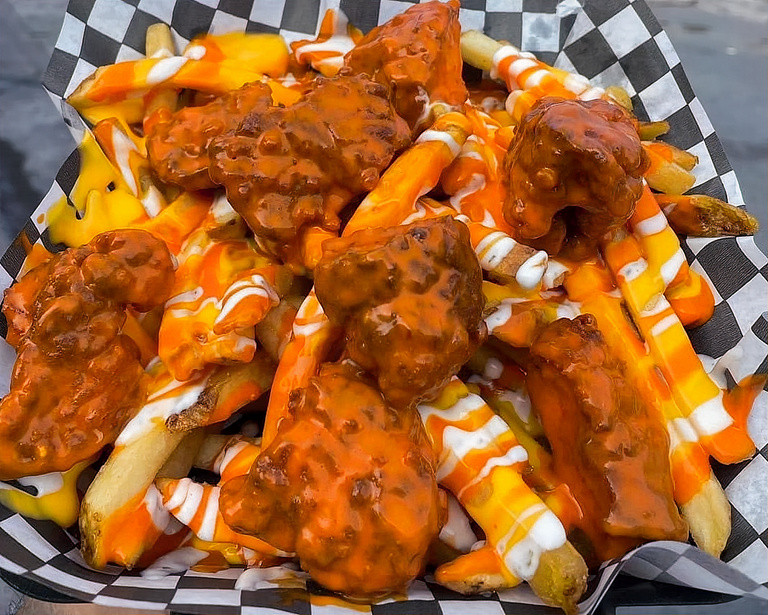 Papas fritas, con aderezo chipotle, y mini boneless de pollo salseados en nuestra icónica salsa Habanero Explosivo, con hilos de aderezo ranch.