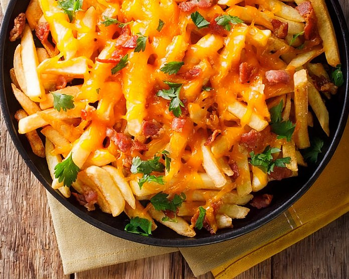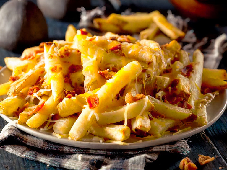 Papas fritas de tu elección, con auténtico queso de nachos de cine, trocitos de tocino horneado, y queso parmesano.