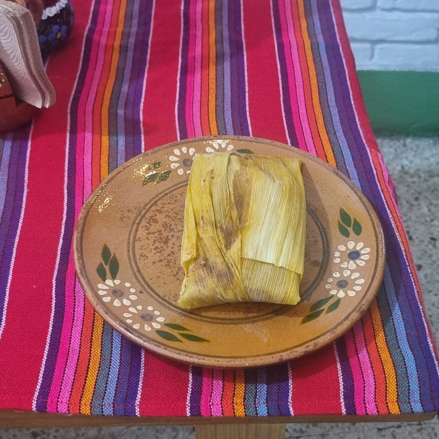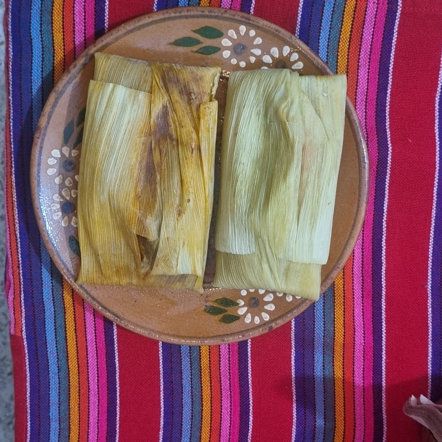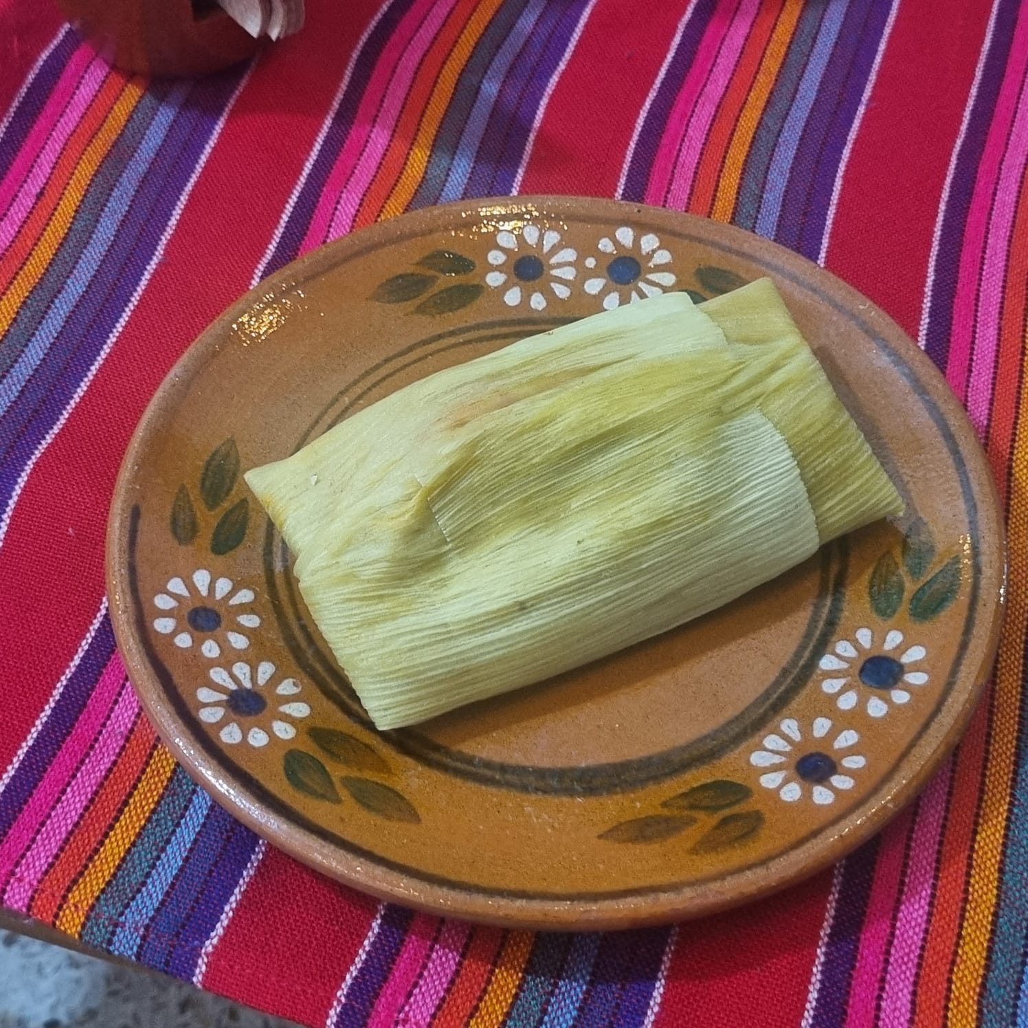 tamal de elote con salsa de chipotle, acompañado de epazote y trozos de cerdo.