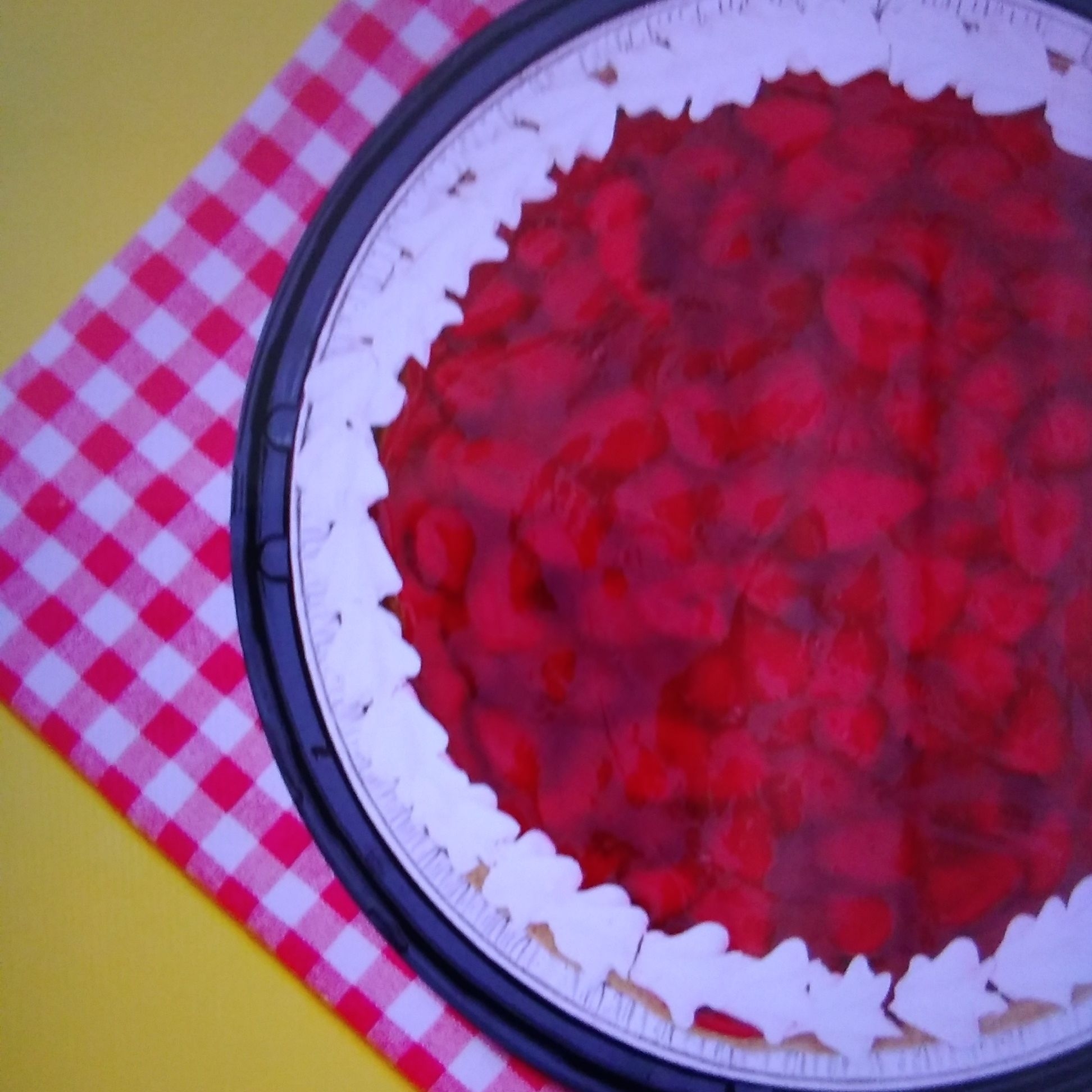 Grande 12 porciones, base de nuez de castilla, una capa de queso crema. Cubierto de trozos de fresa.