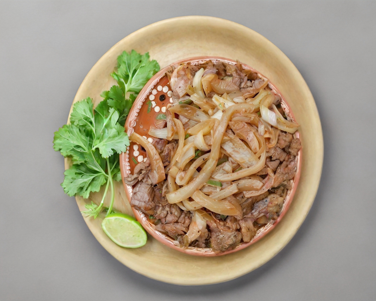Carne de bistec de cerdo frito acompañado de cebolla frita, incluye limones salsas tortillas cilantro y cebolla