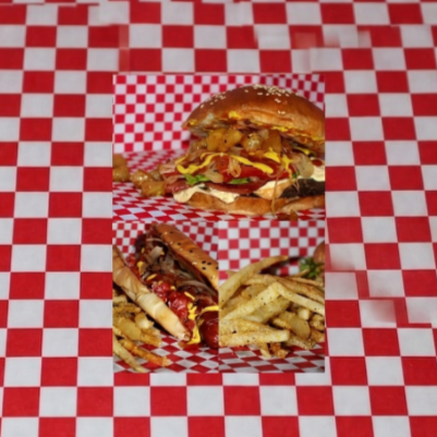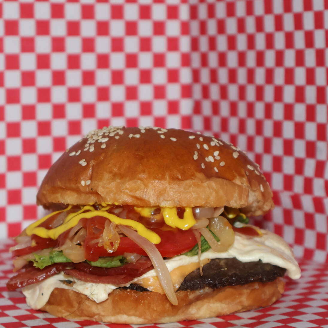130 gramos de carne, queso americano, vegetales (lechuga, tomate y cebolla) y aderezos (ketchup, mostaza y mayonesa)