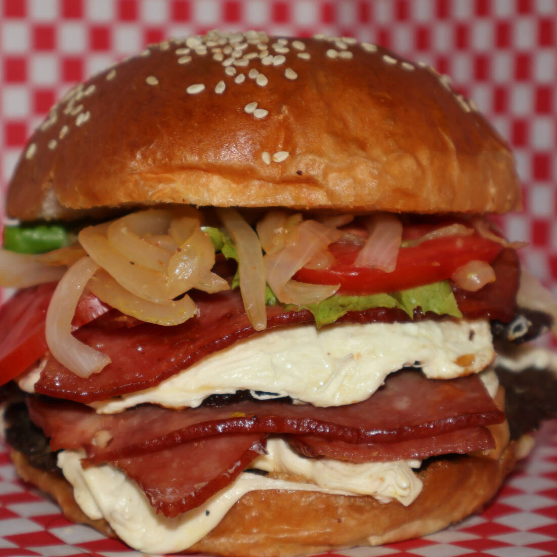 130 gramos de carne, queso americano, queso de hebra, tocino, vegetales (lechuga, tomate, cebolla caramelizada), aderezos (ketchup, mostaza y mayonesa)