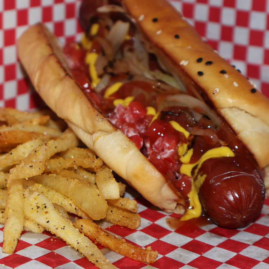 Salchicha de res cuarto de libra, pan, aderezos (ketchup, mostaza y mayonesa) y vegetales (tomate y cebolla)