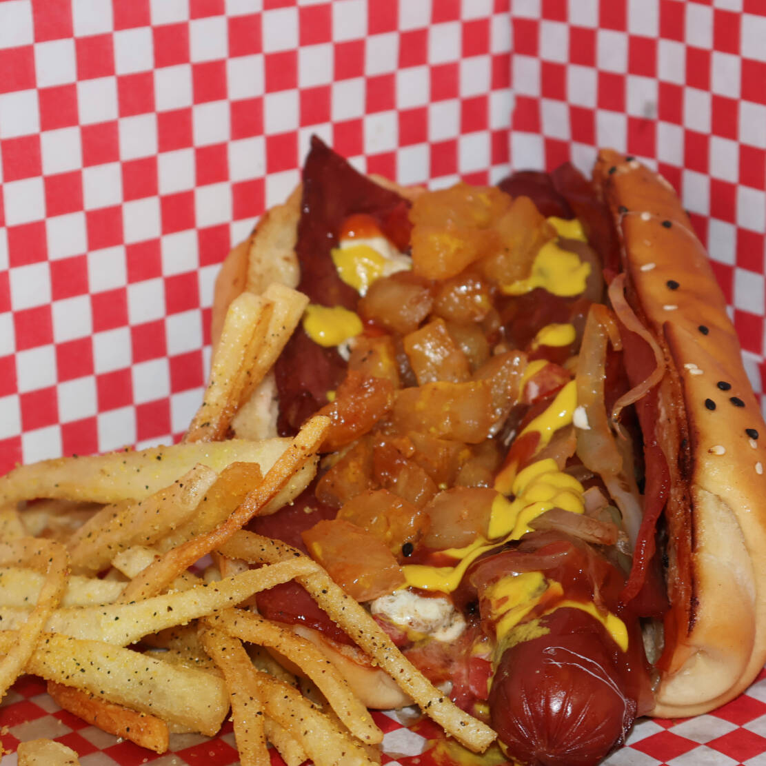 Pan para hotdog con salchicha tipo res, con una costra de queso de hebra, dos tiras de tocino, vegetales (cebolla caramelizada, tomate y chile) y aderezos (Ketchup, mayonesa y mostaza) y piña salteada.