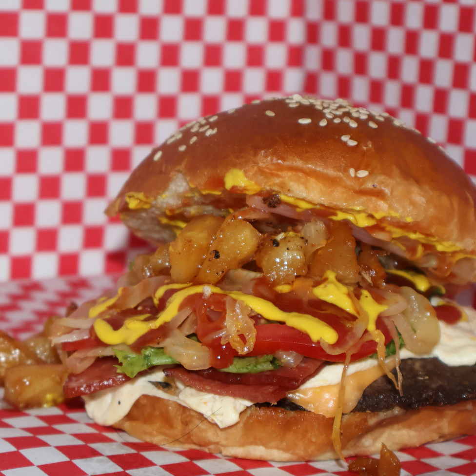 ¿Mucha hambre?, Doble carne, Doble queso americano, doble queso de hebra, doble tocino, vegetales frescos (lechuga, tomate), cebolla caramelizada, aderezos (mayonesa, ketchup y mostaza), picante y su porción de papas.
