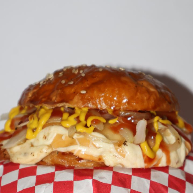 Carne de res, queso americano, queso de hebra, cebolla caramelizada y aderezos (ketchup, mostaza, mayonesa).