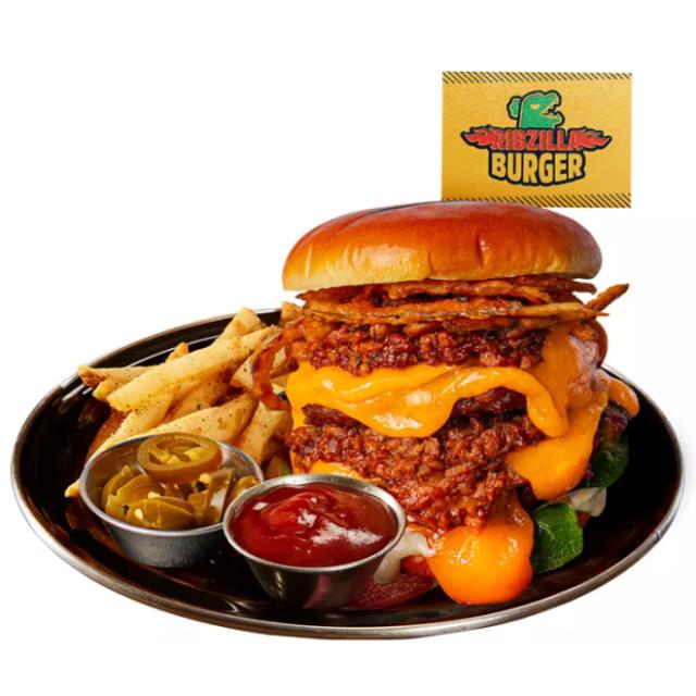 Doble carne de hamburguesa (400 gr), costilla (100 gr) en salsa BBQ, queso Daysi, espinaca, cebolla y chile serrano crispy, con de 250gr de papas
