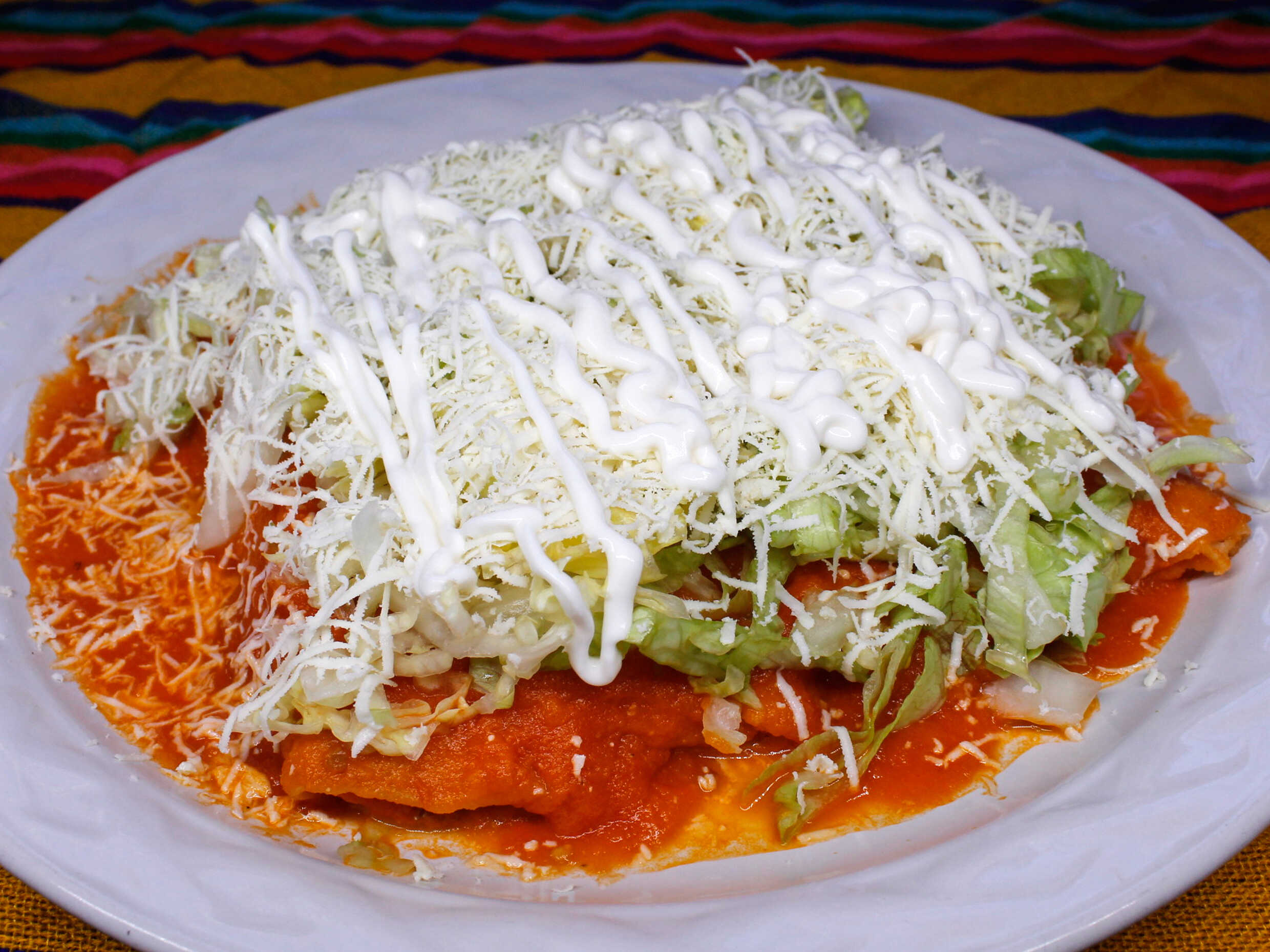 1 orden de 4 enchiladas sencillas cubiertas en salsa de preferencia, decoradas con lechuga, queso y crema.