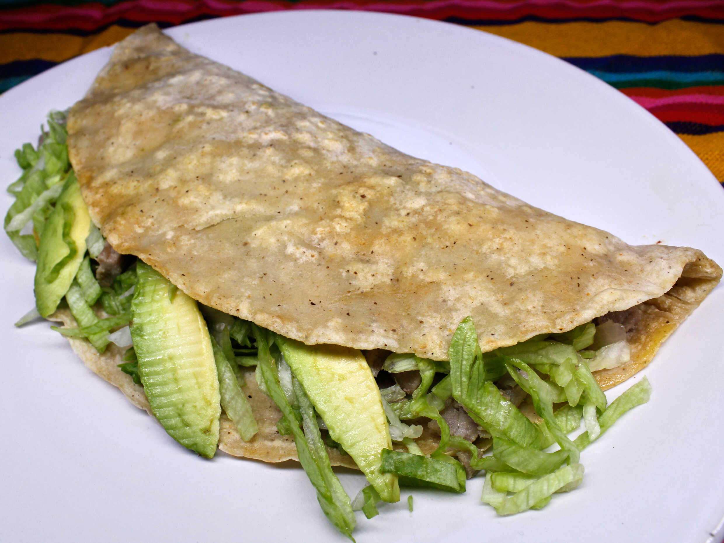 1 quesadilla gigante con queso de hebra, acompañada de lechuga y aguacate.