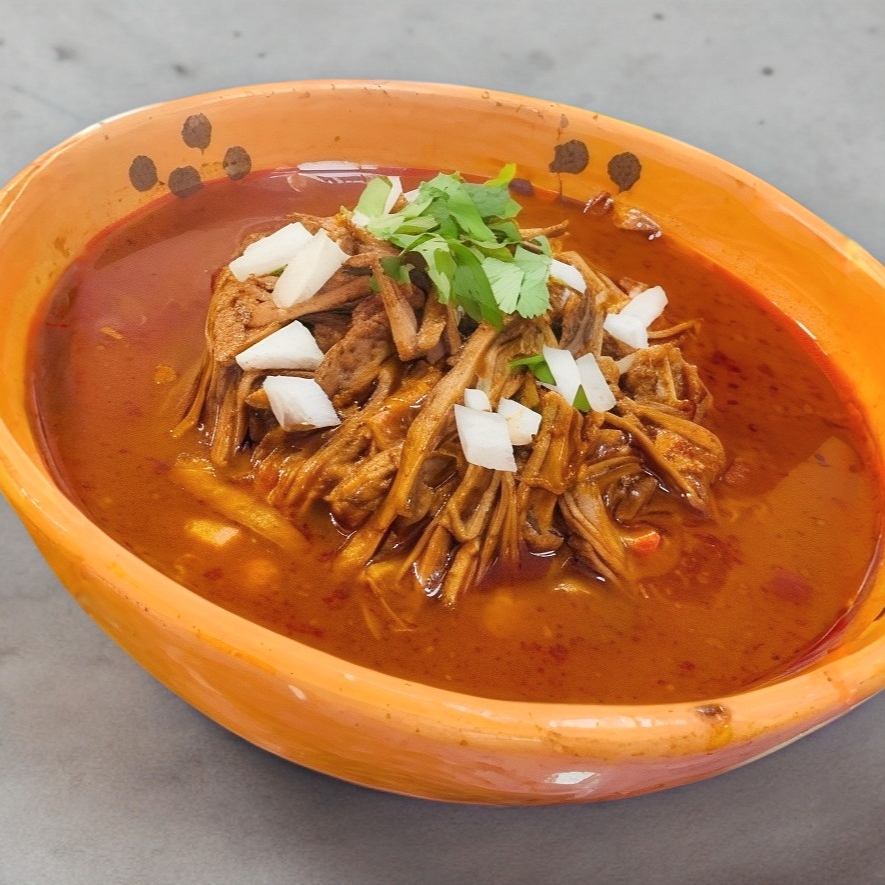 1 Kilo de carne deshebrada de birria, acompañado de 1 litro de caldo de birria picosito, incluye complementos: 5 panes, 20 tortillas, cebolla, cilantro, limones, y salsa.