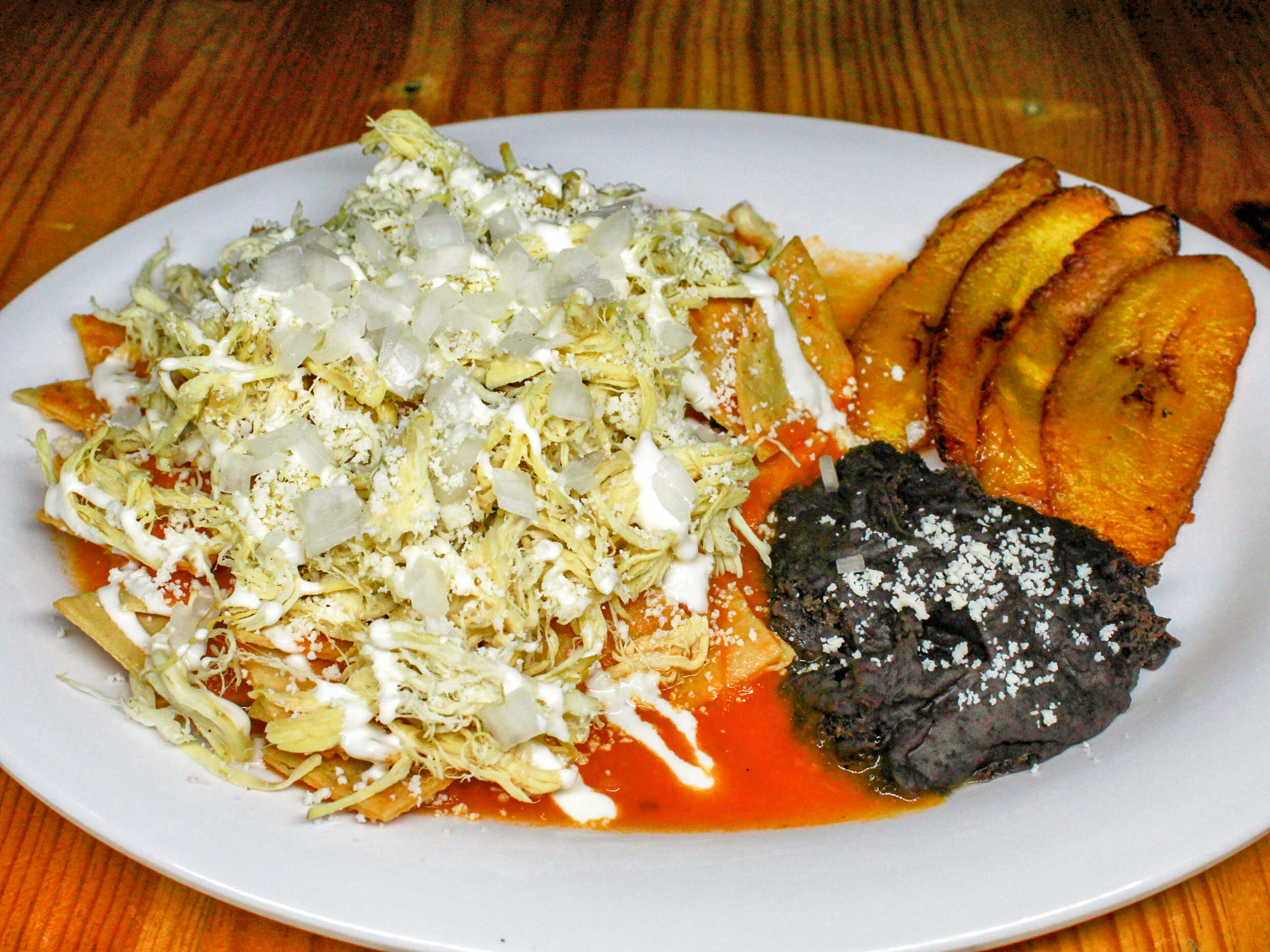 Chilaquiles rojos con proteína a elegir, acompañados de plátano macho y frijoles.
