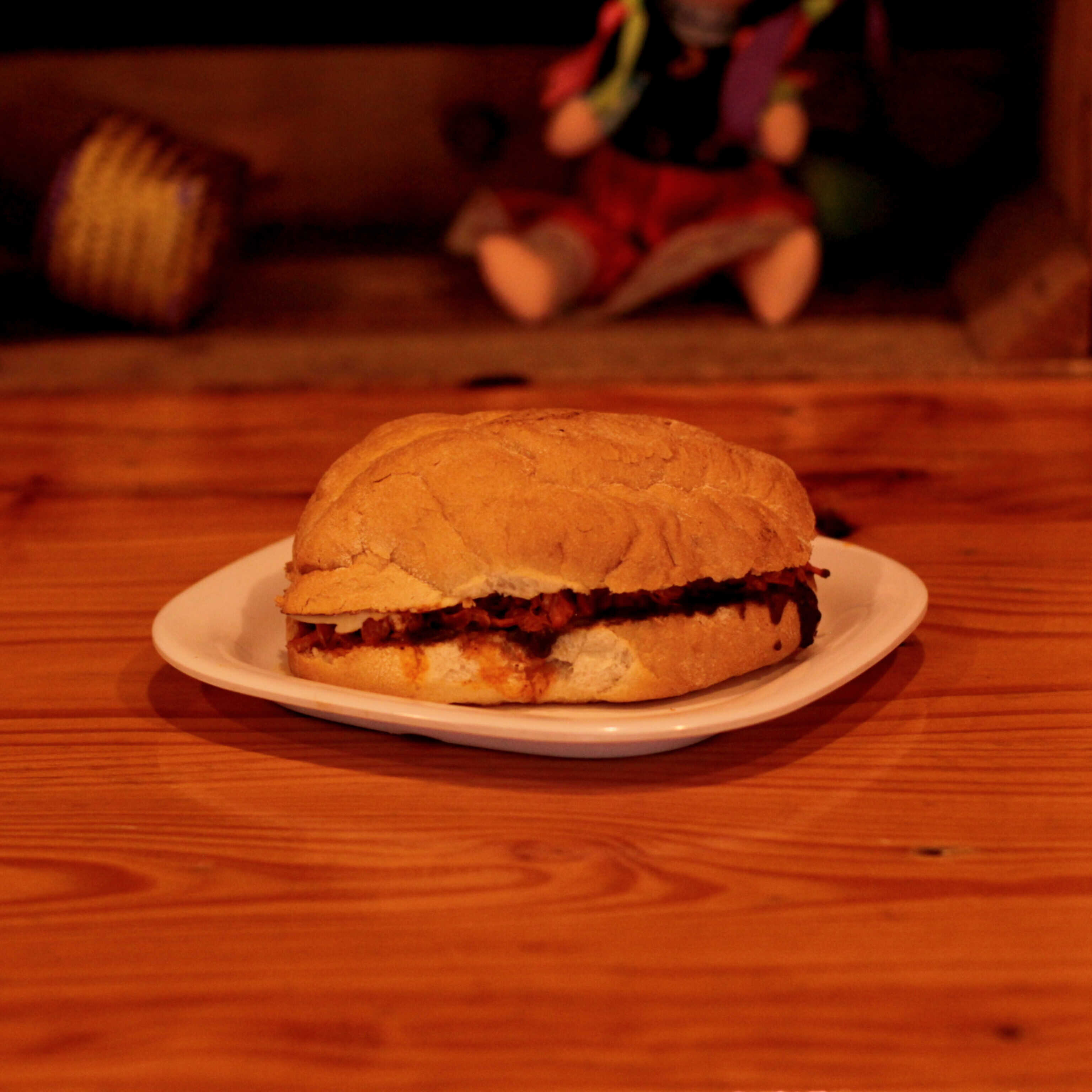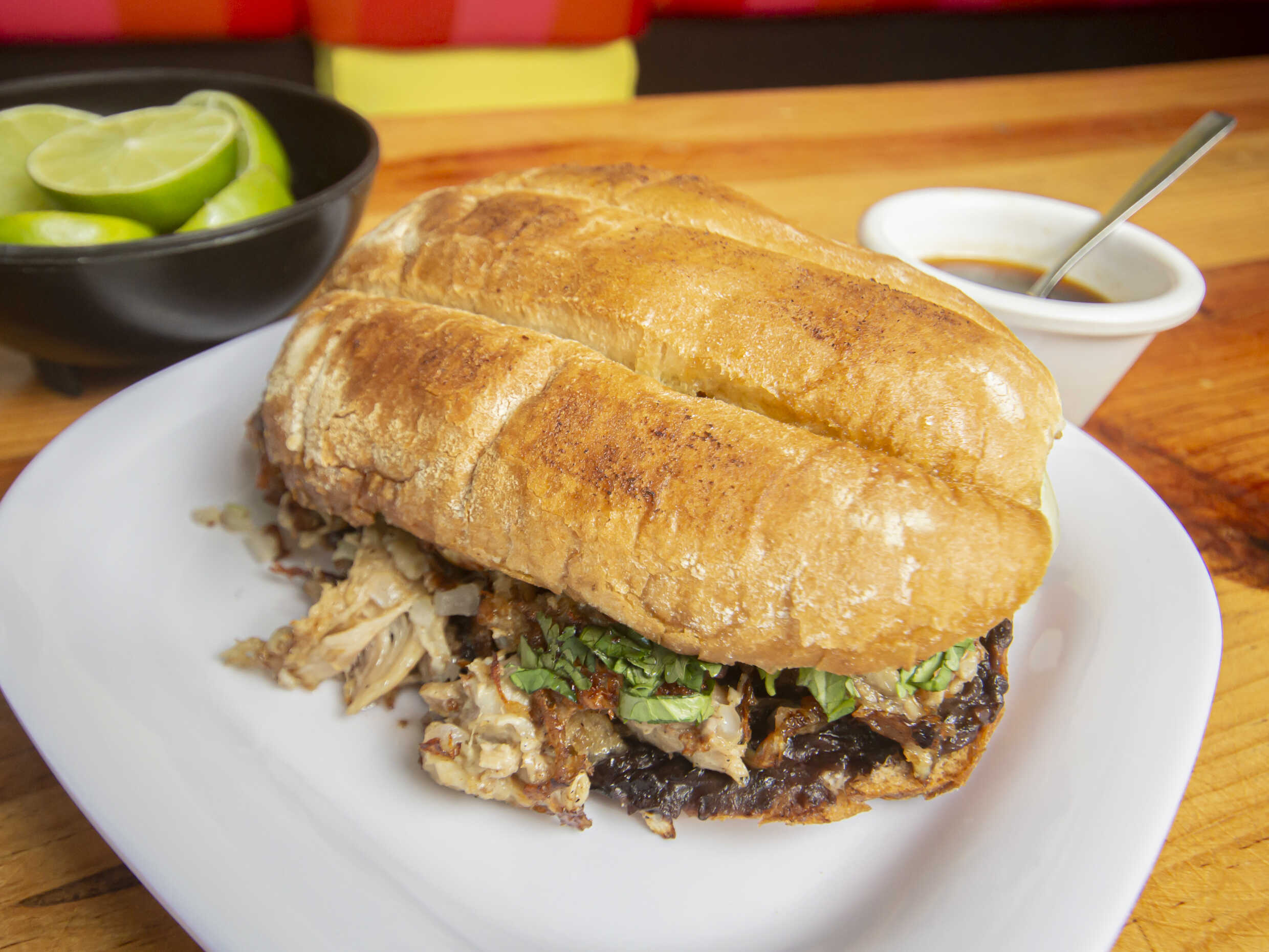 Torta de carnitas servida en bolillo tradicional.