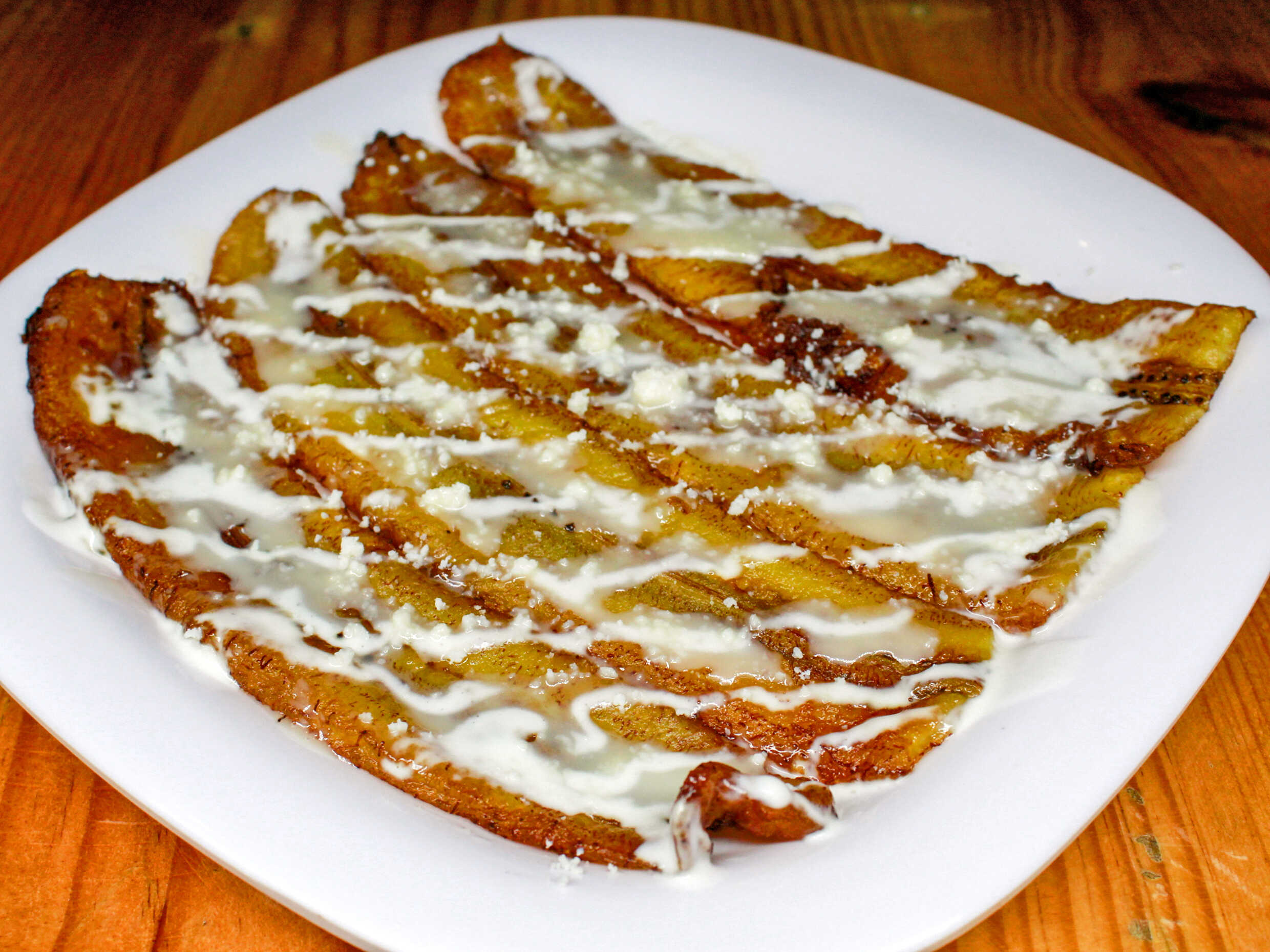 Plátanos fritos, orden individual de 4 rebanadas, acompañado de lechera, crema y queso.