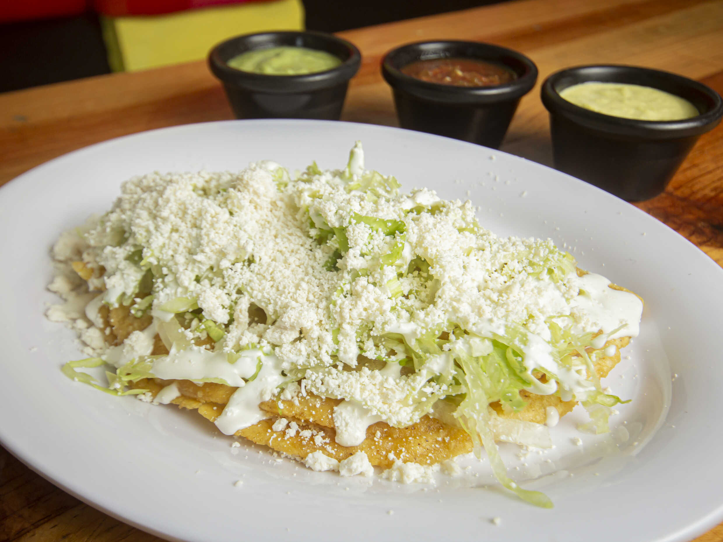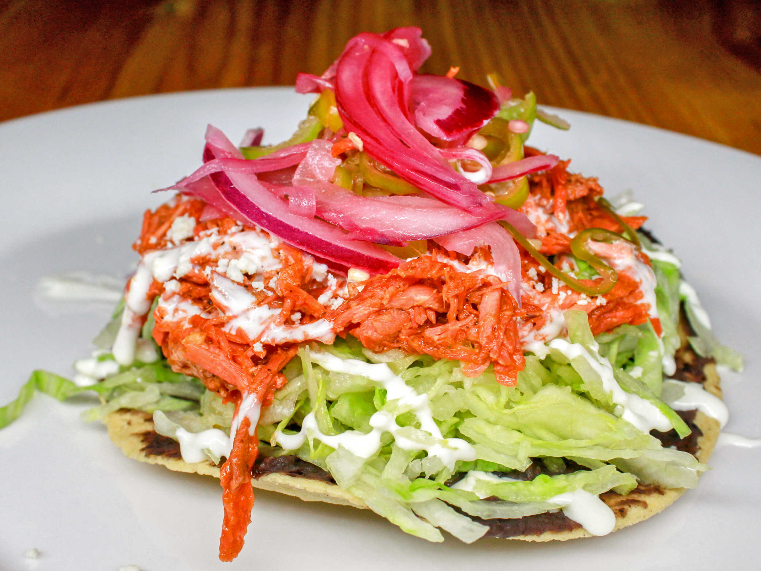 Deliciosa tostada con ingrediente a elegir, acompañada con lechuga, crema y queso.