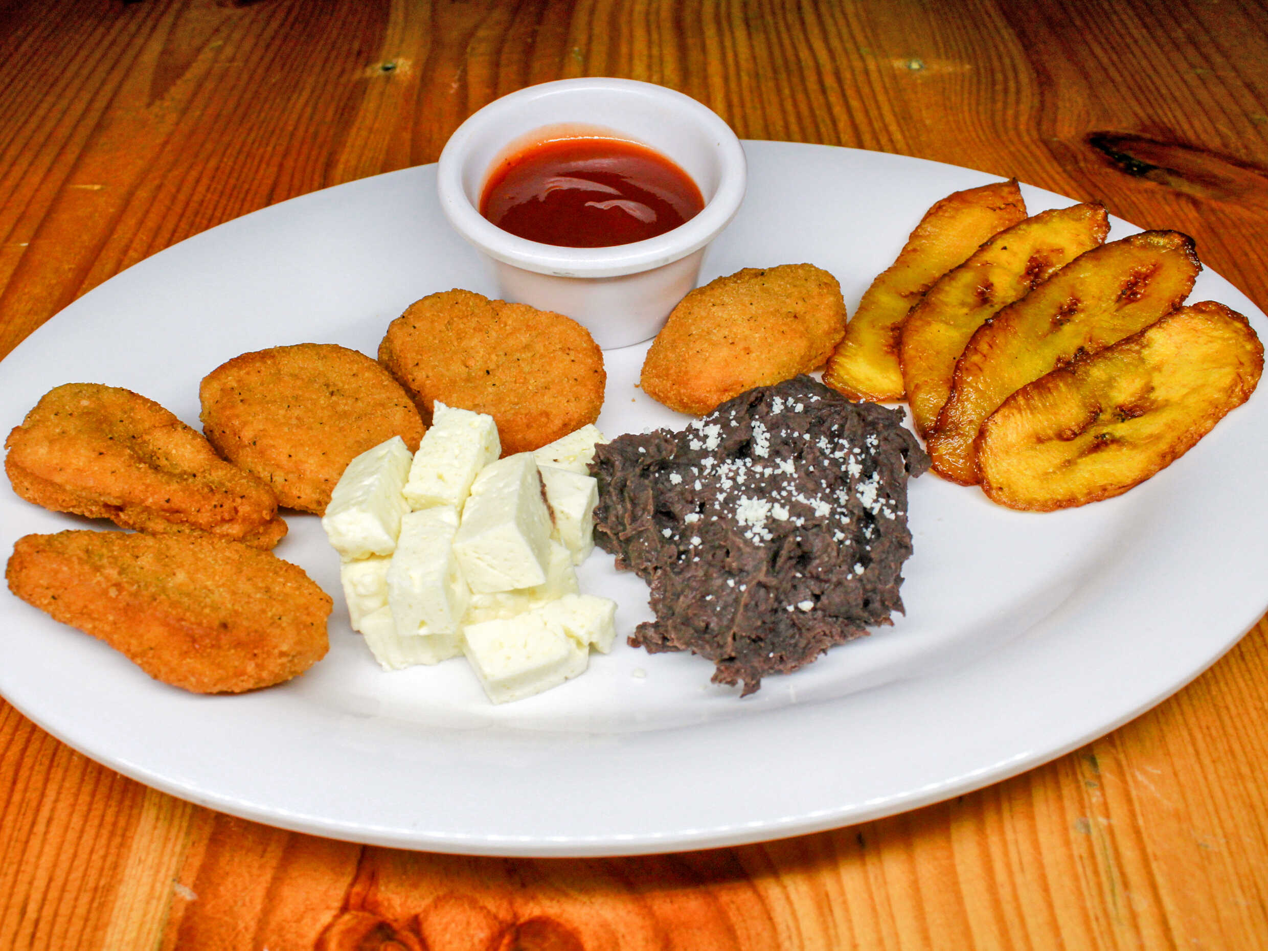 5 Nuggets de pollo acompañada con plátano macho y frijoles.