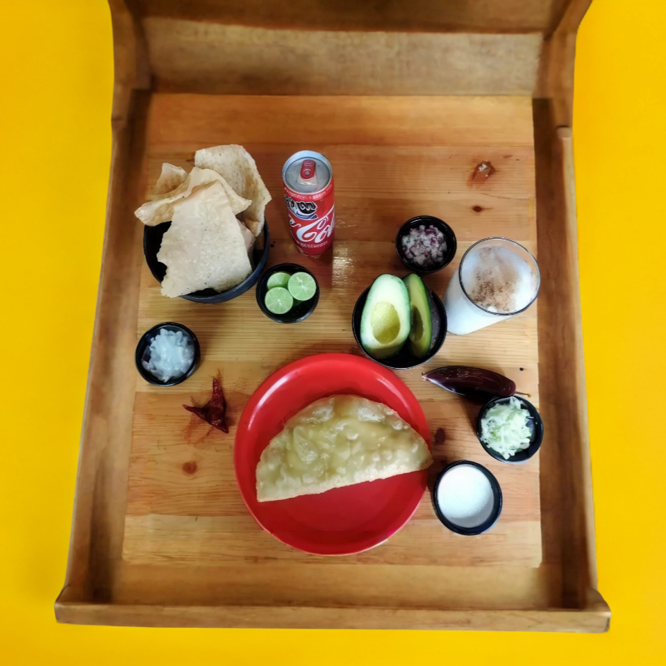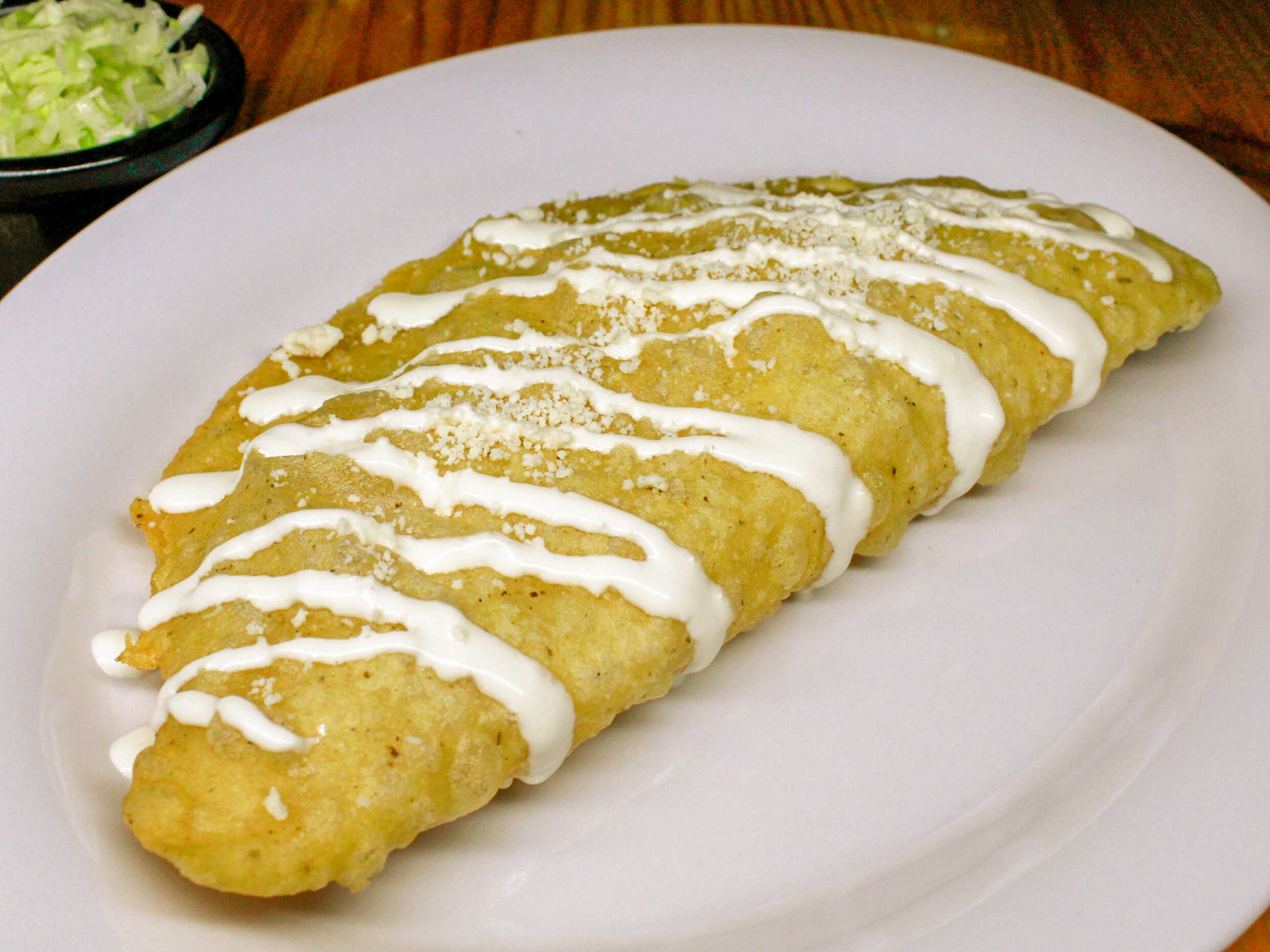 Empanada de queso, acompañada de frijoles, lechuga, epazote, rajas de chile, crema y queso.