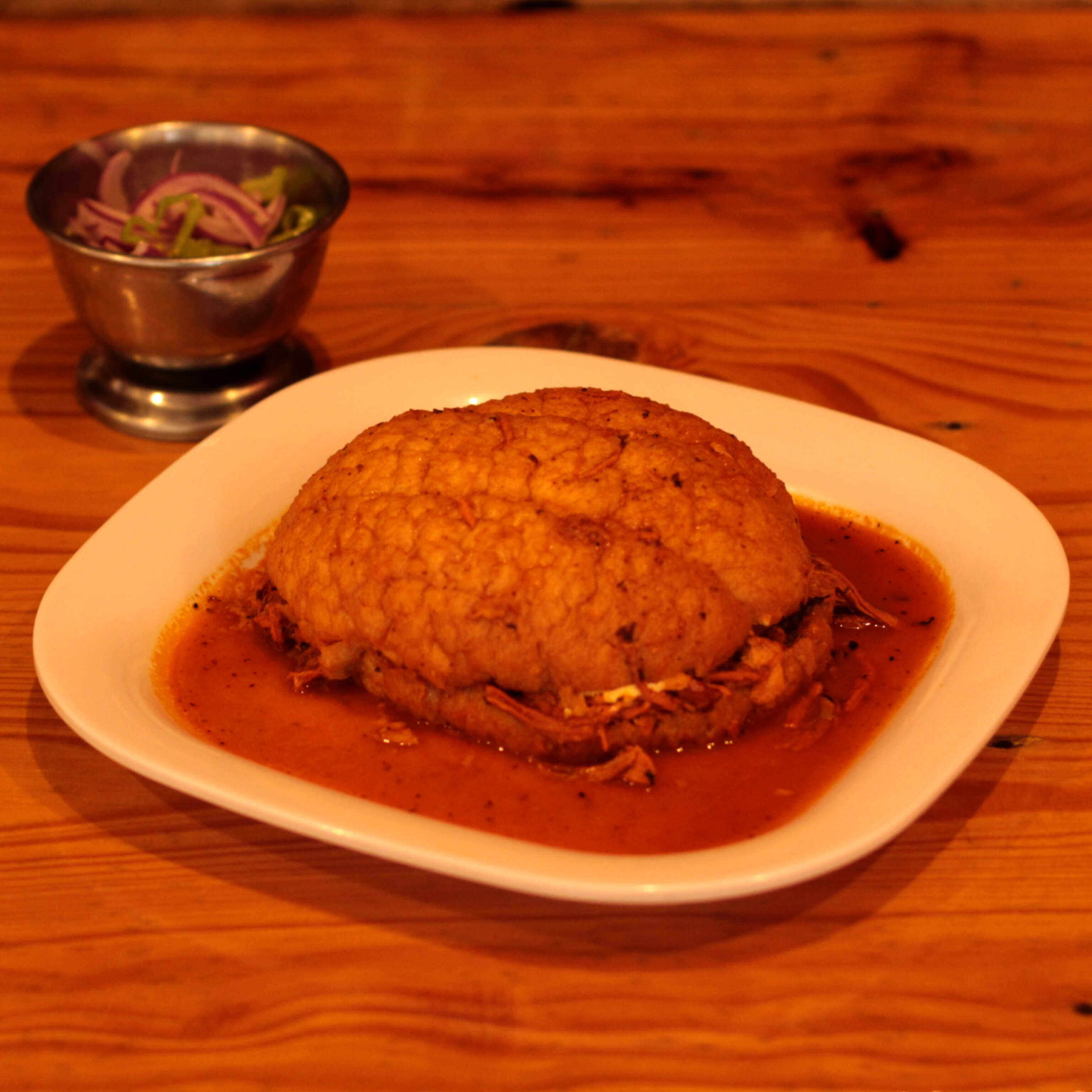 Exquisita torta de cochinita, bañada con caldo de cochinita pibil.