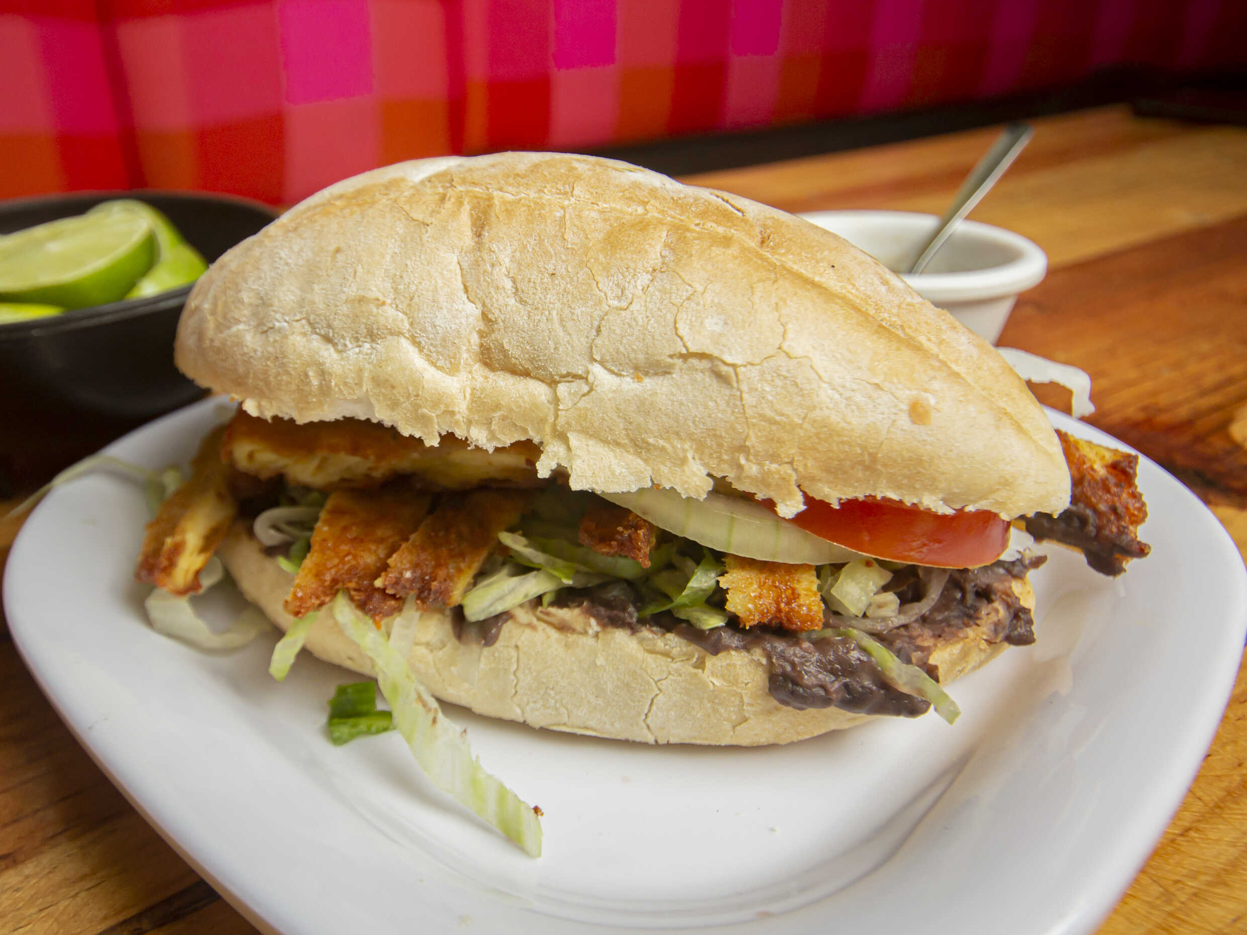 Torta de cochinita pibil servida en bolillo tradicional y acompañada de frijoles.