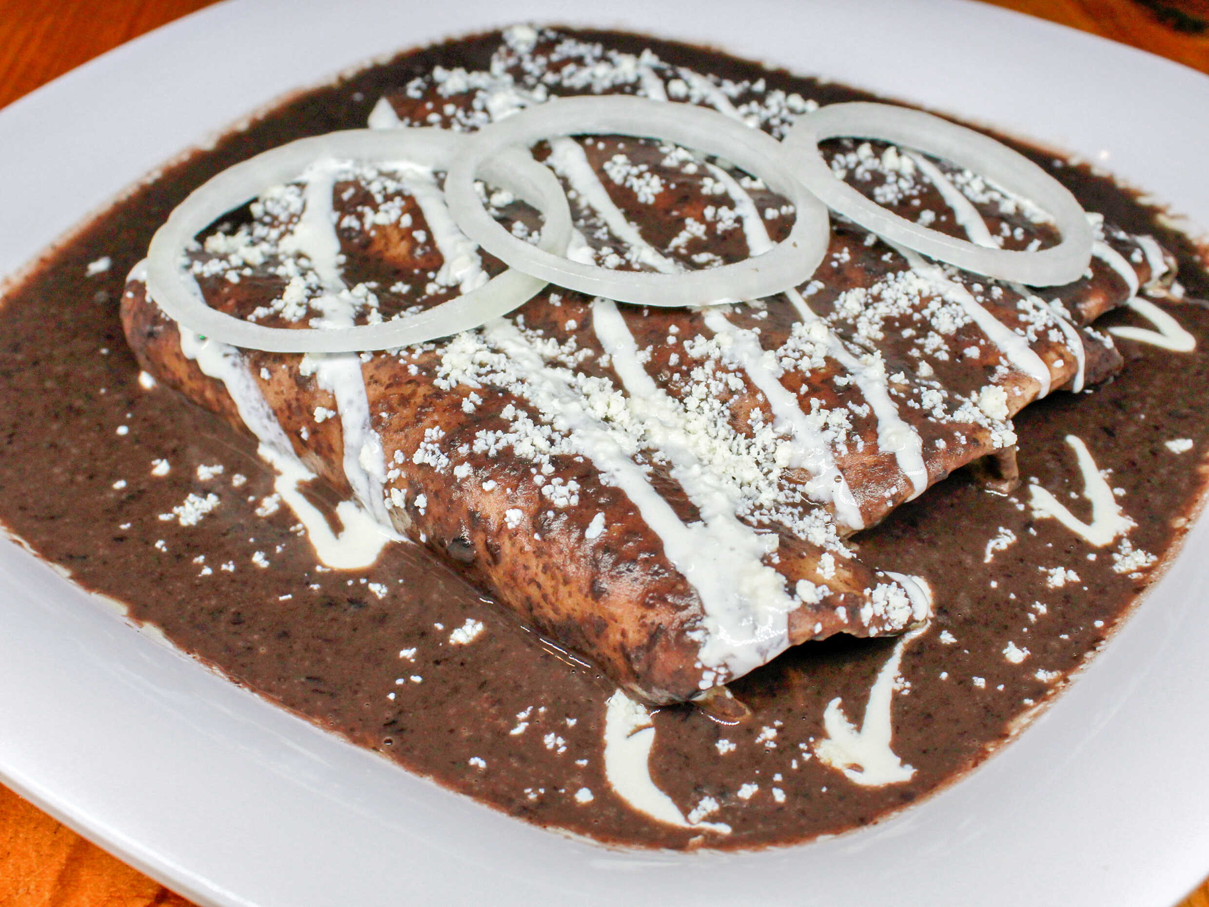 4 Enmoladas de tortilla de maíz rellenas de proteína a elegir y bañadas en mole.
