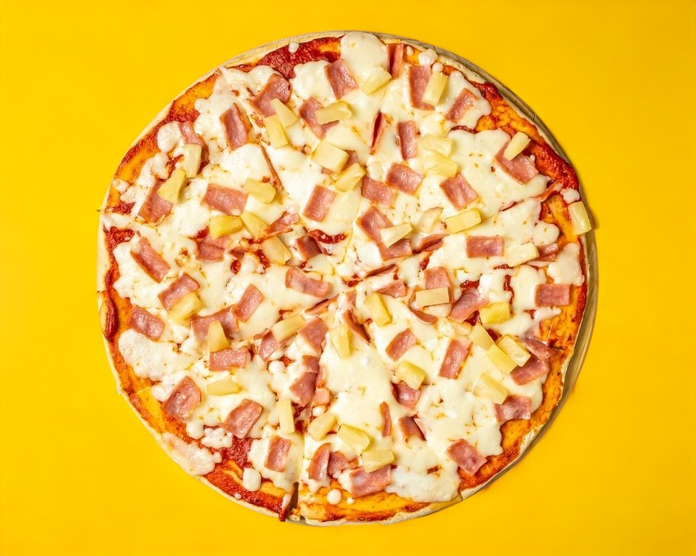 Salsa de tomate, queso mozzarella, piña y jamón.