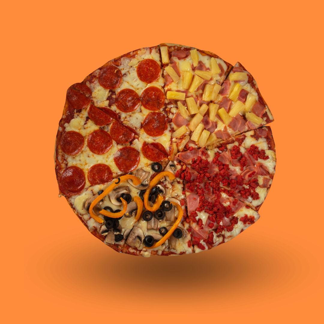 Salsa de tomate, queso mozzarella, pepperoni, jamón, tocino, chorizo, champiñones, aceitunas negras y pimiento.