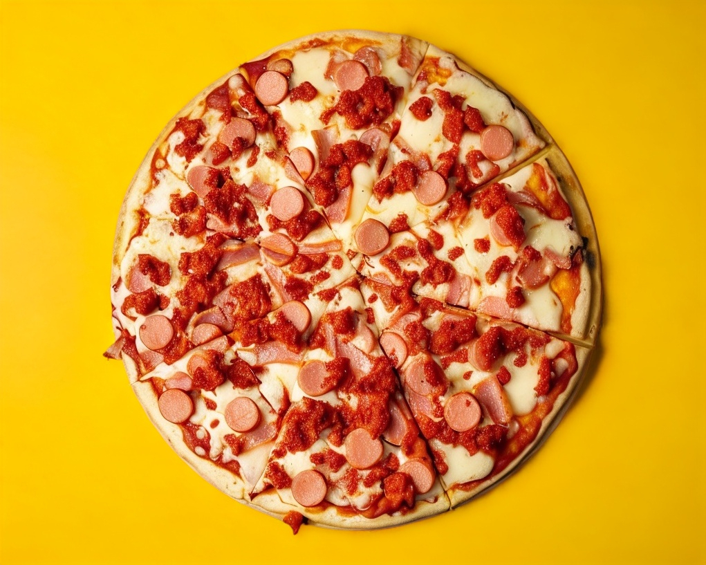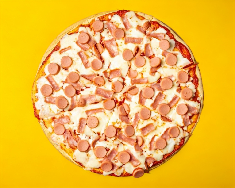 Salsa de tomate, queso mozzarella, salchicha y tocino.