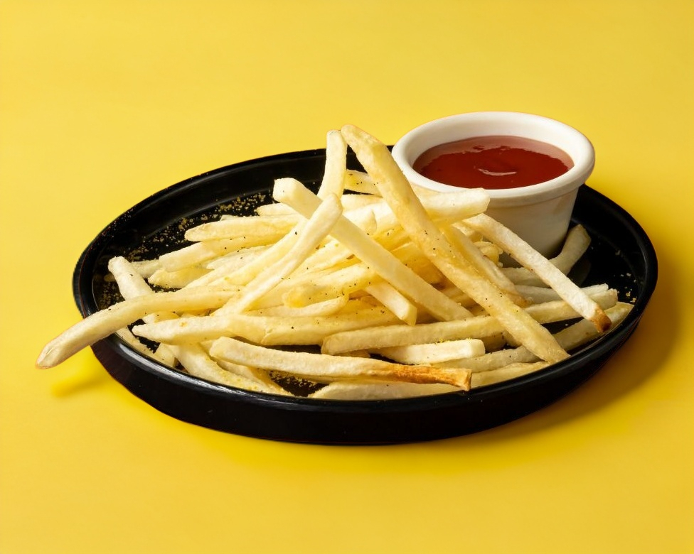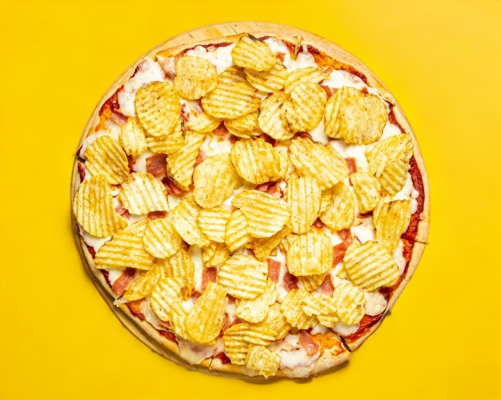 Salsa de tomate, queso mozzarella, tocino y papas fritas crujientes.