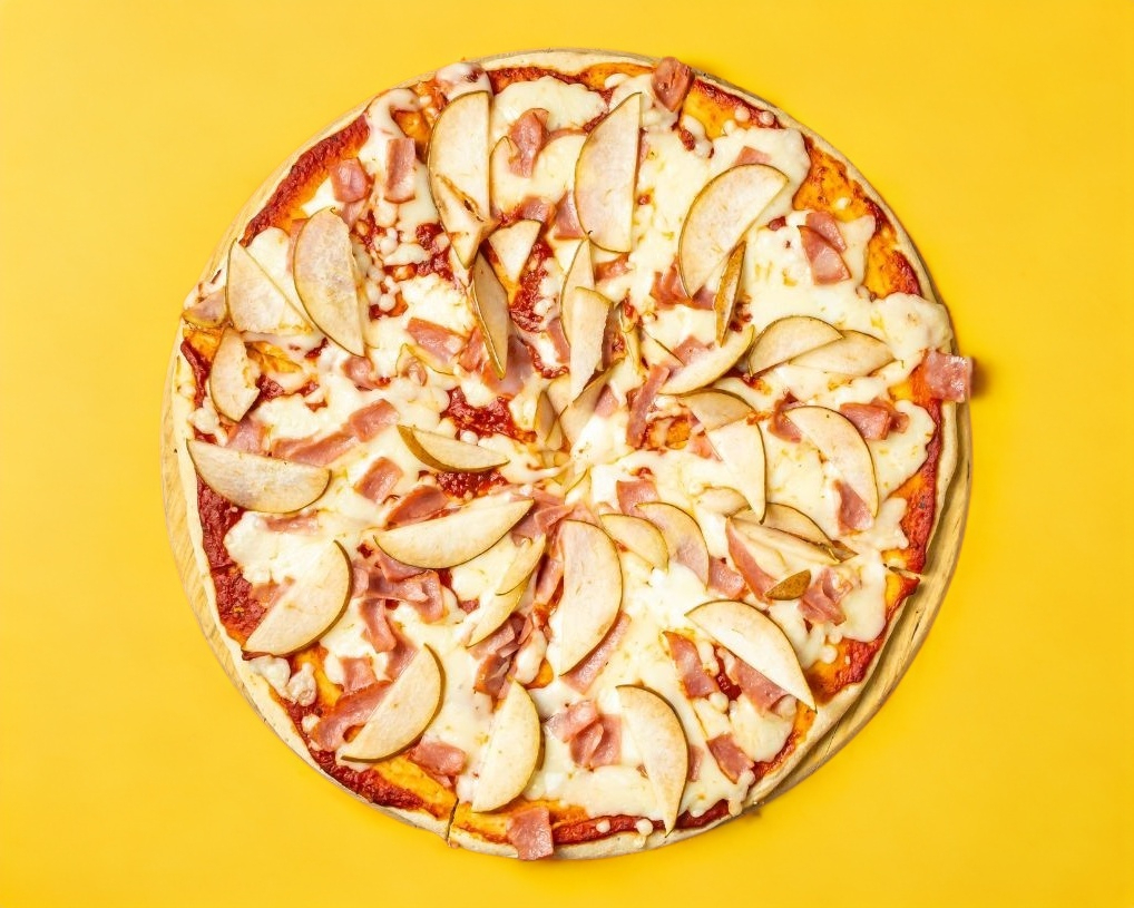 Salsa de tomate, queso mozzarella, pera y tocino.