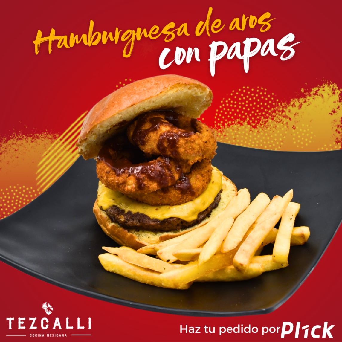 Pan brioche con 150g de arracherasirloin, 3 aros de cebolla, queso americano y BBQ de la casa acompañada de 120g de papas