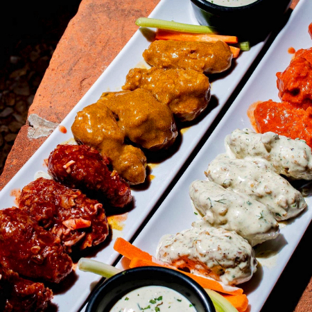 8 piezas de coliflor preparadas con el mismo proceso de nuestras alitas, bañadas en salsa de su elección, acompañadas de bastones de vegetales y aderezo ranch.