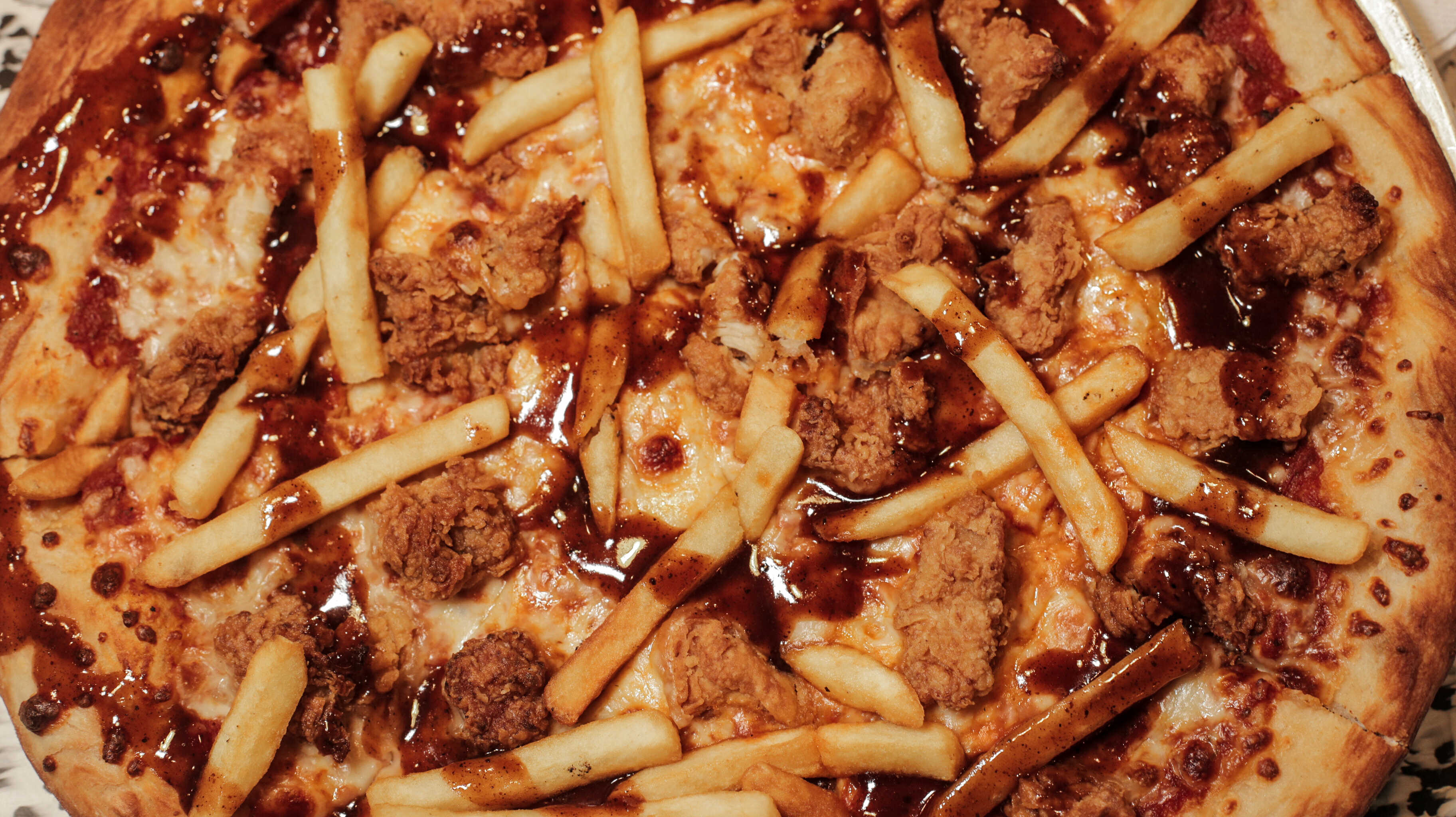 Masa New York original, queso mozzarella, salsa pizza, pechuga de pollo crujiente, salsa BBQ y papas a la francesa.