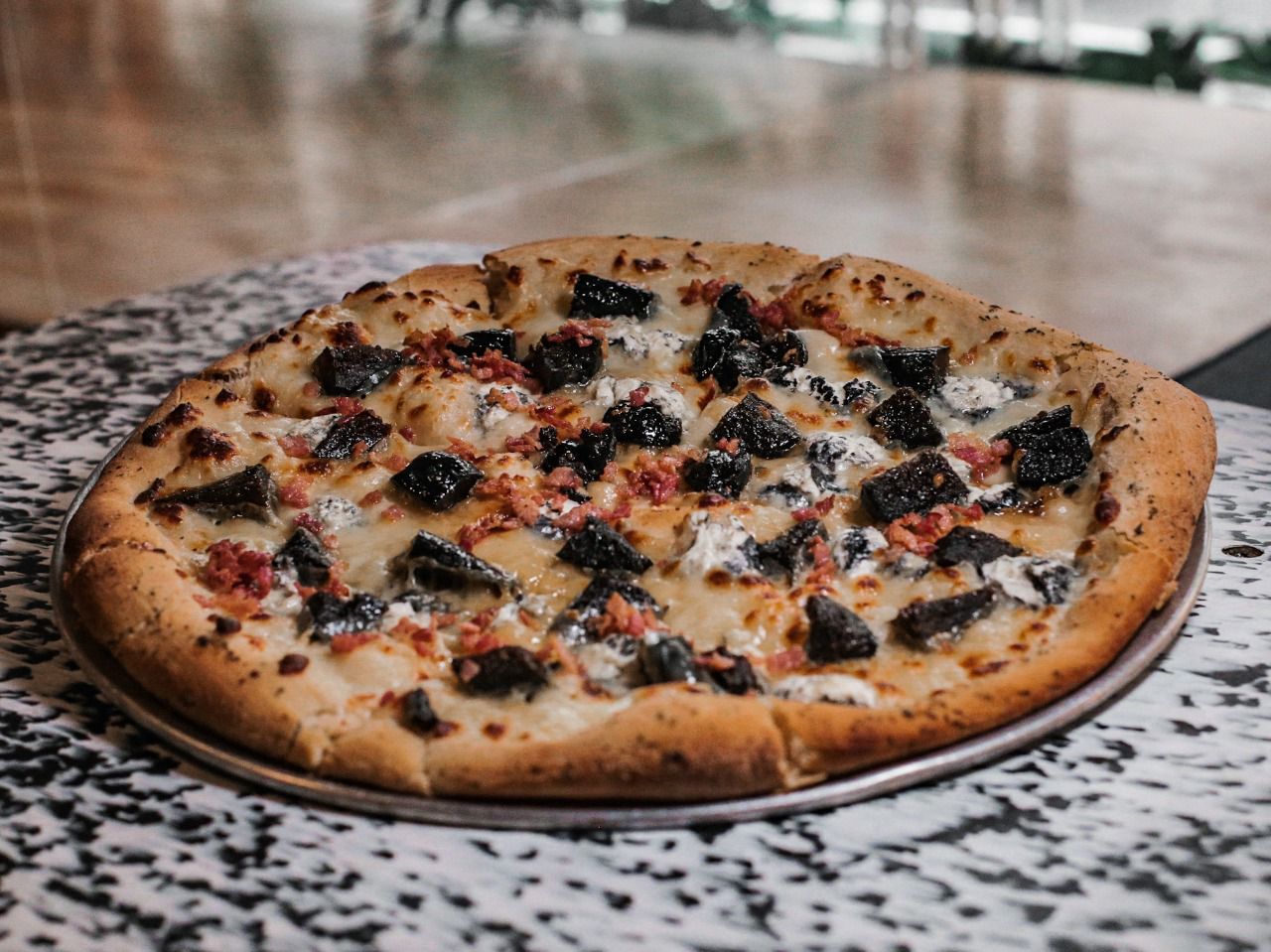 Masa New York original, queso mozzarella, base blanca con aceite de oliva, higos caramelizados, queso de cabra cenizo y tocino.