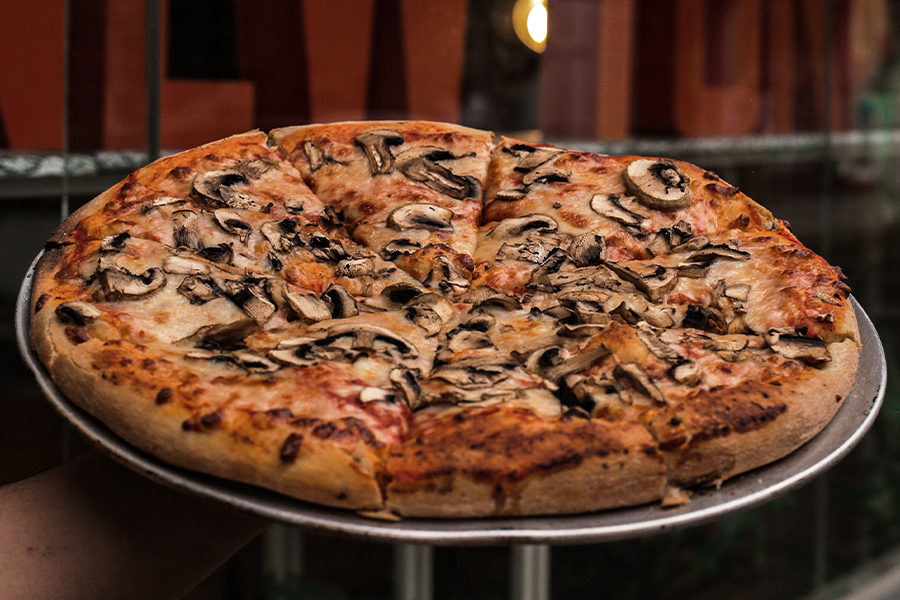 Masa New York original, queso mozzarella, salsa pizza y champiñones.
