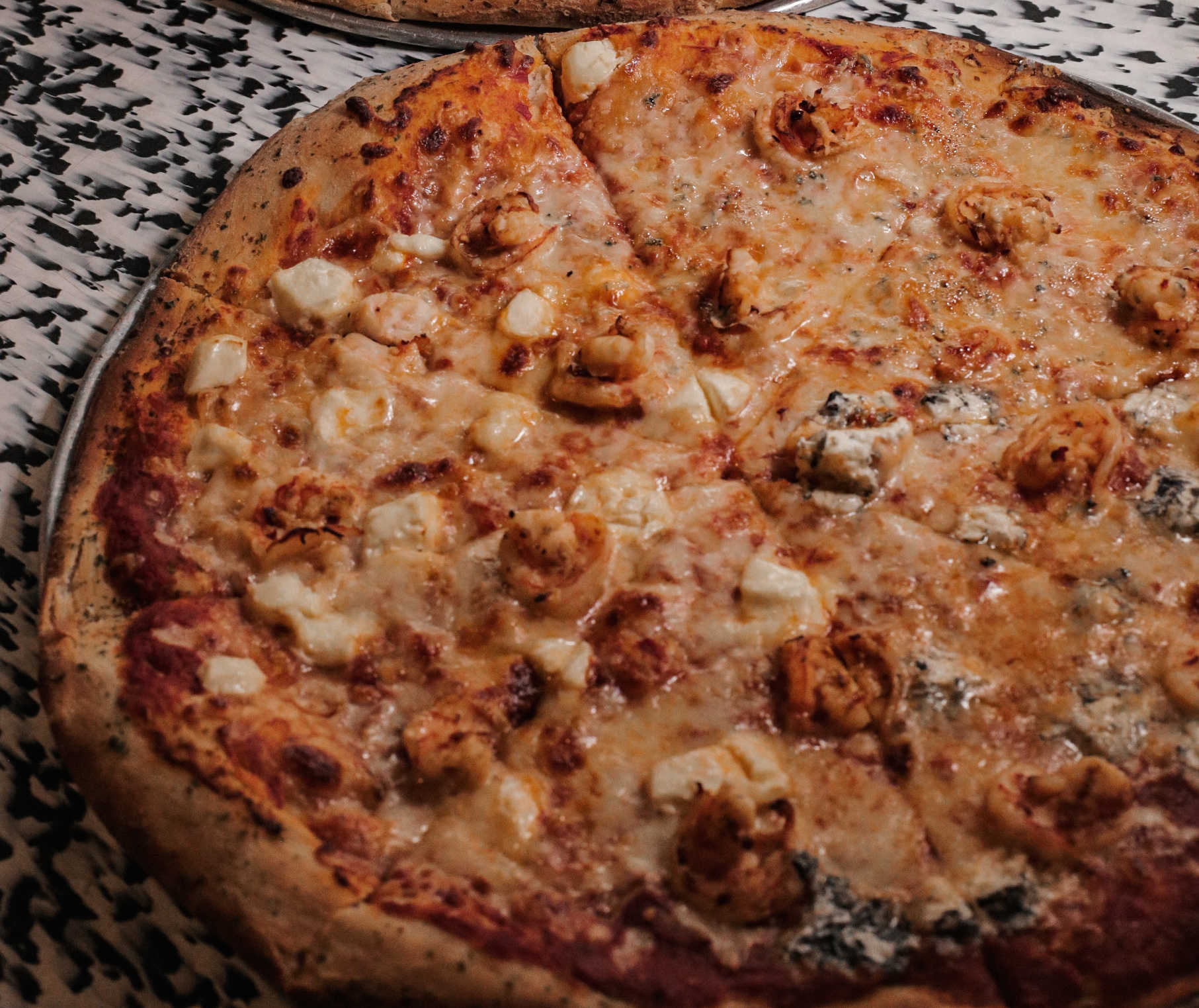 Masa New York original, salsa pizza, queso mozzarella, queso azul, queso crema y queso parmesano.
